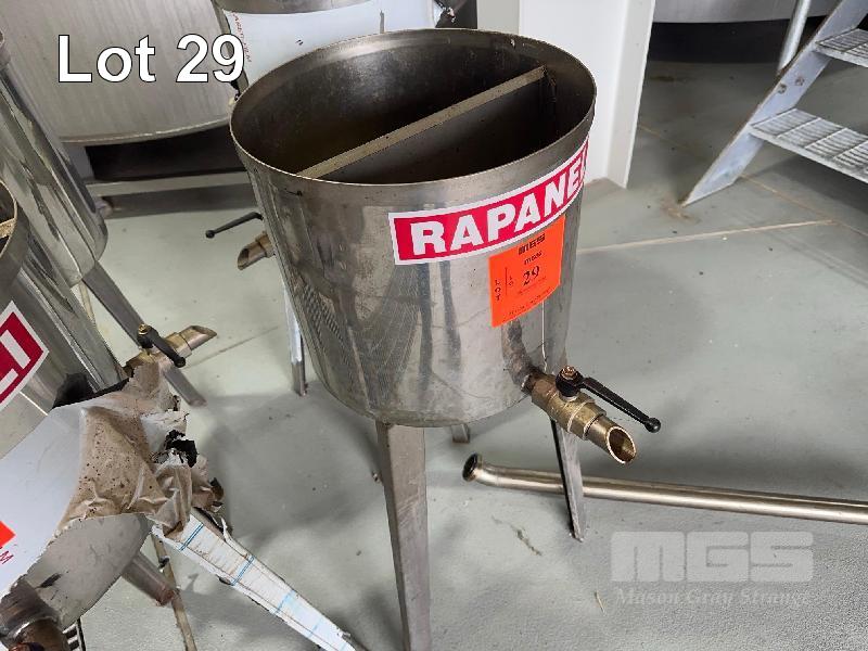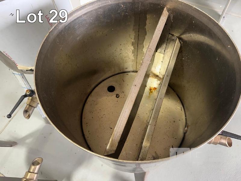 2 x STAINLESS STEEL ROUND TUBS ON STAND 385 (D) x 350 (H) ON STAINLESS STEEL LEGS FITTED WITH INTERCEPTION PLATES