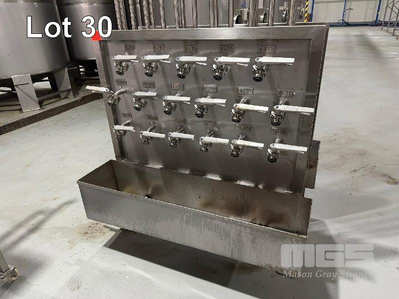 STAINLESS STEEL MANIFOLD STAND WITH 17 KEY STONE 1" VALVES & SPILL TRAY NOTE: PIPEWORK TO CEILING ONLY