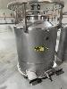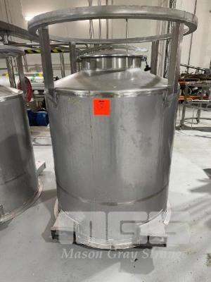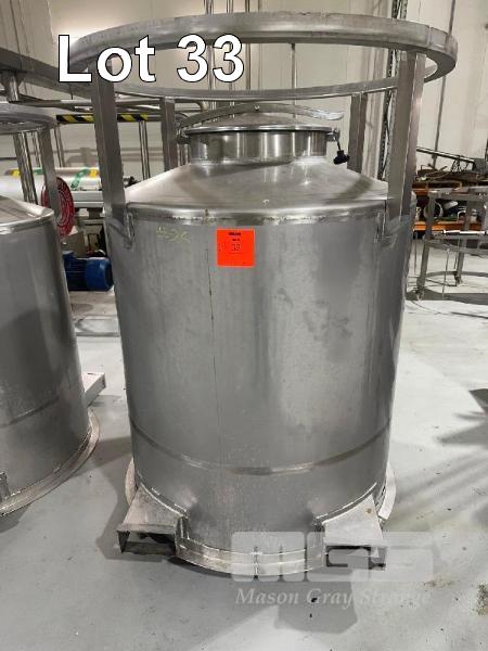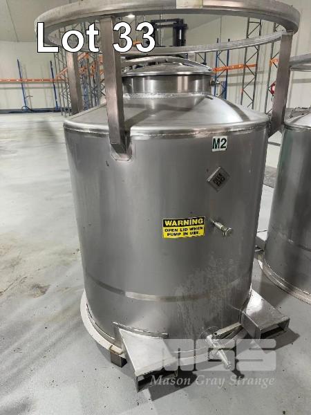 STAINLESS STEEL MOVABLE UPRIGHT TANK, 800 LITRE APPROX WITH FORK POCKETS HATCH TO TOP SIDE OUTLET