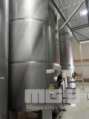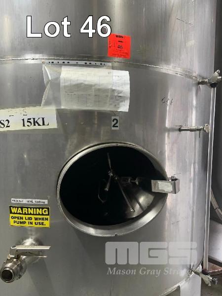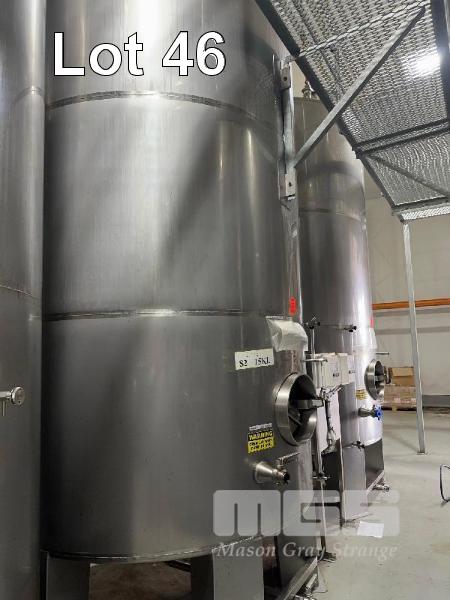 STAINLESS STEEL UPRIGHT TANK, 15,000 LITRE CONE BOTTOM ON LEGS LEVEL GAUGE TO 5,000 LITRE BOTTOM & SIDE OUTLET VALVES INCLUDES CIG REGULATOR, FITTING & LIFTING LUGS DIGITAL TEMP READOUTS & SENSORS