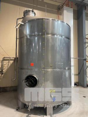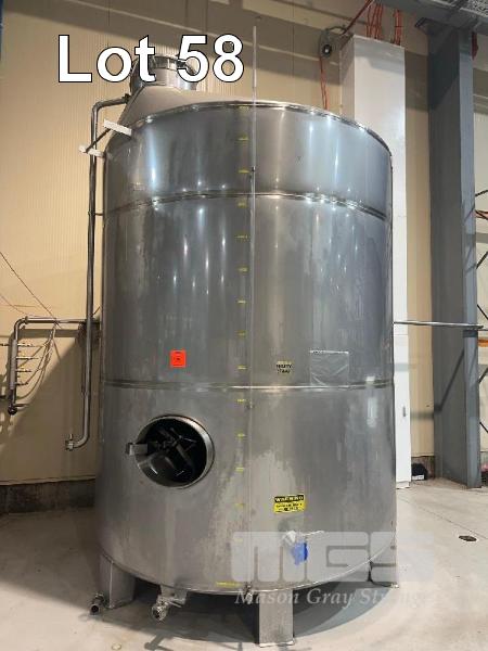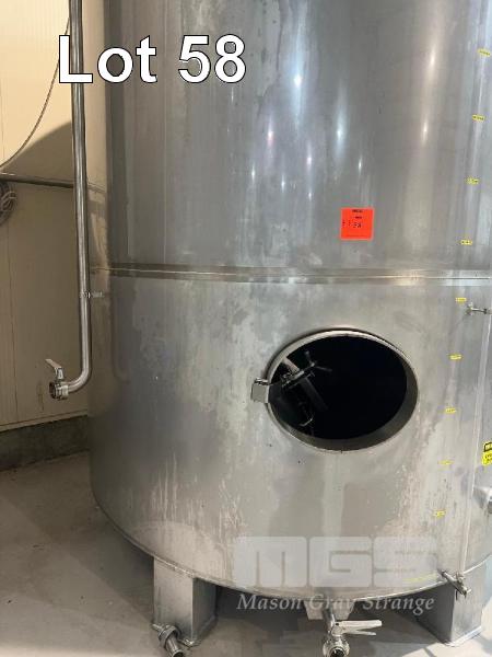 STAINLESS STEEL UPRIGHT TANK, 14,000 LITRE SLOPED BOTTOM ON LEGS HATCH TO TOP & SIDE INFEED LINE TO TOP WITH VALVE