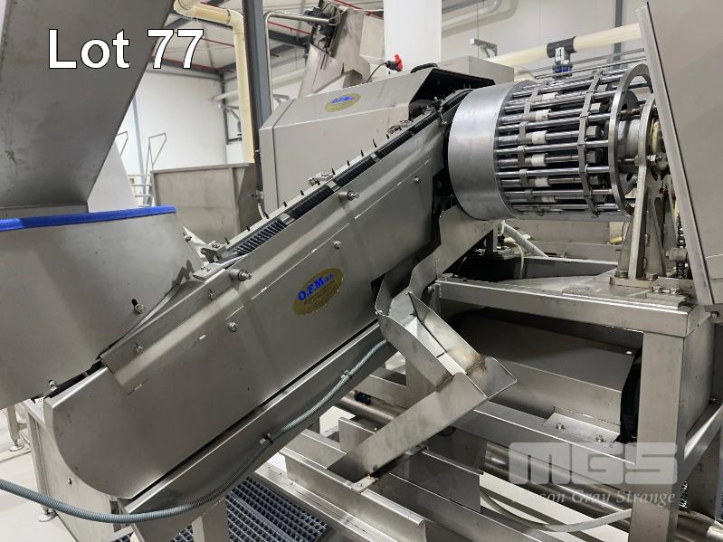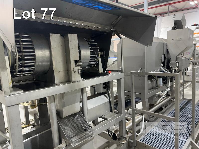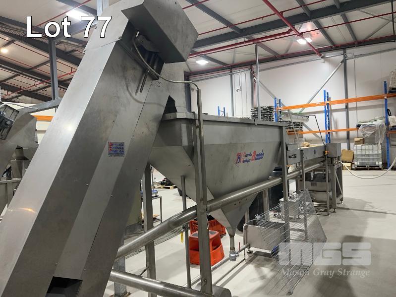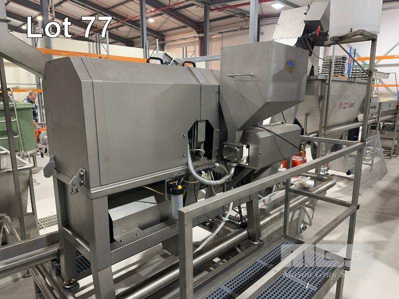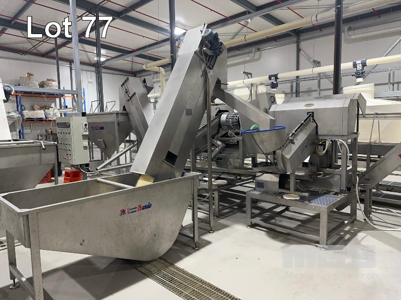 PITTING SLICING LINE, DTB STAINLESS FLOODED ELEVATOR & DELIVERY HOPPER 300mm, STAINLESS STEEL CLAD, DTB MOD: ELC300RED WITH DUAL OUTLET CHUTES TO DTB, O.F.M 2 x PITTING SLICERS, MOD: TBMORA-41 & TBP5151 TO STAINLESS STEEL HOPPER TANK & BUCKET ELEVATOR MOD: ELC300RED WITH TANK CIRCULATION PUMP TO STAINLESS STEEL DENSIMETER TANK MOD: DSS70 WITH CIRCULATION PUMP TO FLAT BELT INSPECTION CONVEYOR MOD: CI600LU TO FINAL RINSE & DELIVERY STATION WITH WATER RECOVERY TO INCLUDE SWITCHBOARD