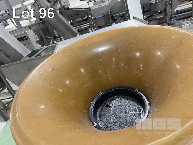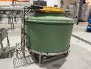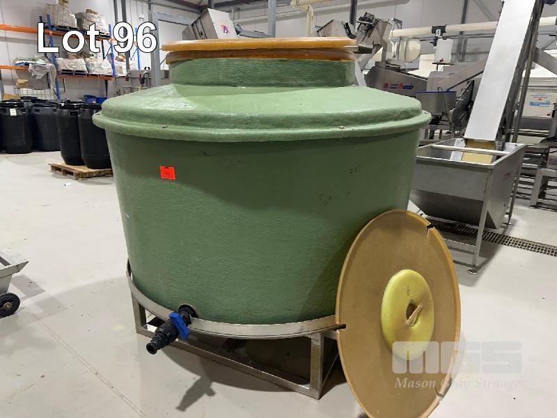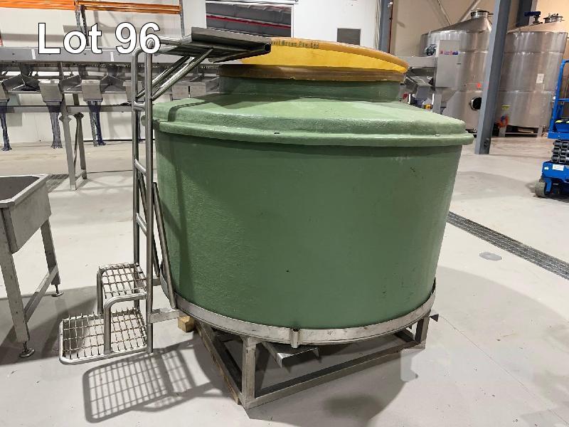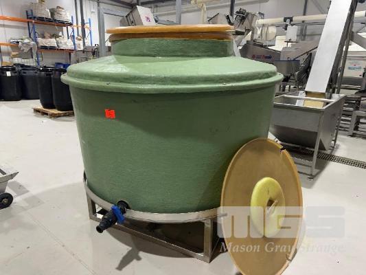 FIBREGLASS BRINE TANK, 1800mm DIAMETER APPROX 1400mm (H) APPROX ON FORK POCKETED SKID BASE BOLTED LID WITH STRAINING TOP FILLER INSERTS STAINLESS STEEL LADDER ACCESS