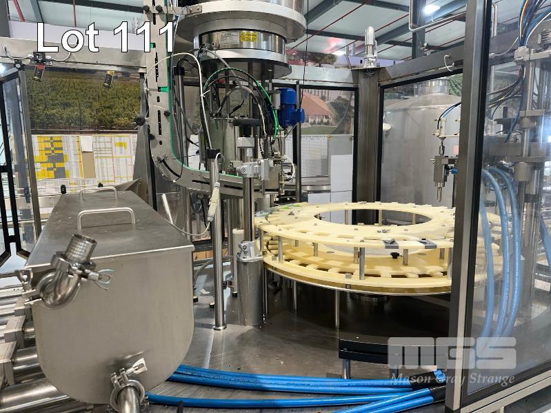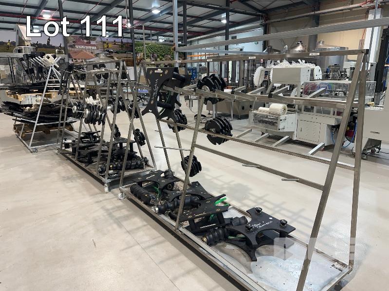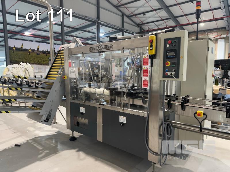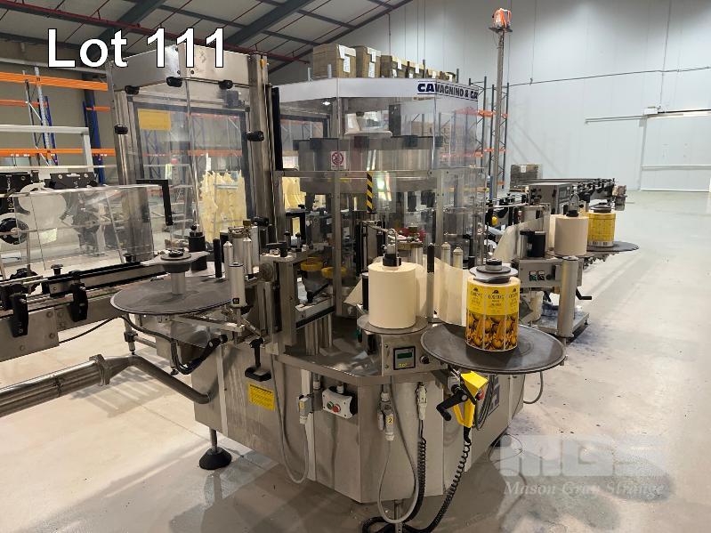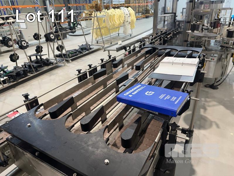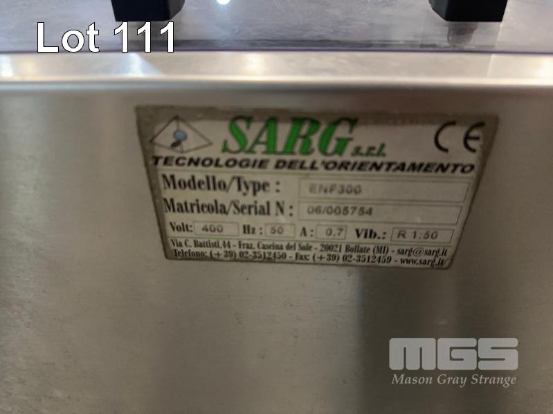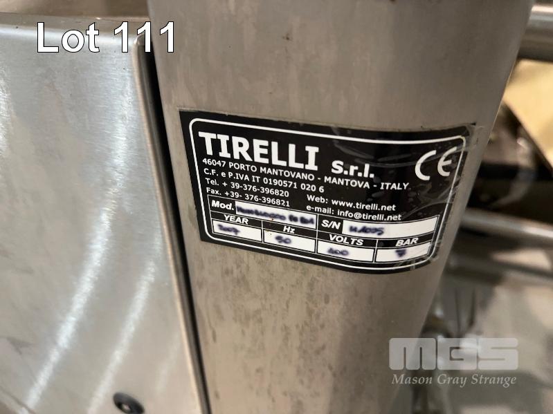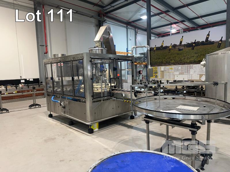 AUTOMATED BOTTLING/FILL LINE TO INCLUDE ROTARY BOTTLE DELIVERY TABLE TIRELLI 6 HEAD FILLING STATION MOD:MONOBLOC 6P + IRO S/NO: M1095 BUILT: 2006 WITH SARG AUTO CAPPER & BULK BIN/ELEVATOR MOD: ENF-300 S/NO: 06/005754 TRAVELLING ON CONTINUOUS SLAT CONVEYOR STAINLESS STEEL BODY OFF CHUTE BOTTLE TABLE APPROX 15m CONVEYOR LINE POWER TO ROBINO & GALANDRINO AUTO CAP COVER & SHRINK WRAPPER MOD: MONOSTADIOF4T DOM: 2006 S/NO: 0M004064127 WITH ROBINO & GALANDRINO MULTI CAP AUTO LOADER 4 TIER, MANUAL LOAD TO VARIABLE LANE CONVEYOR POWER FEEDING CAVAGNINI & GATTI AUTO LABELLER & CODE STAMPING MOD: CG/E103XPSP S/NO: A5310 DOM: 2006 WITH CODEMARK AUTO DATE CODE PRINTER MOD: A100 CONSOLE COUNTER FOR LINE OUT FEEDING CONVEYOR TO CIRCULAR DISPATCH STAND TO INCLUDE 4 x MOBILE RACKS OF BOTTLE SIZE TOOLING TO SUIT BOTTLE LINE