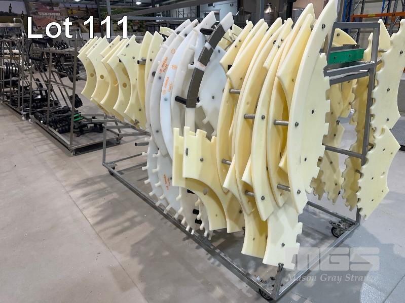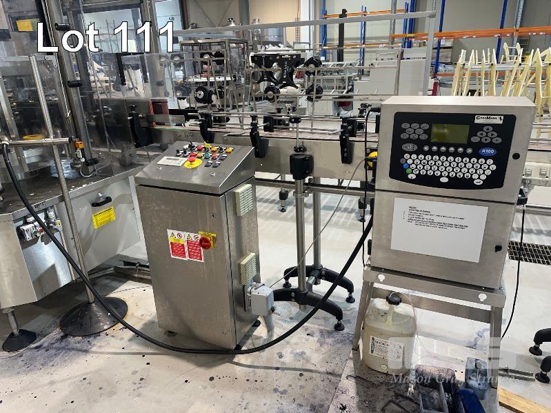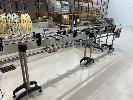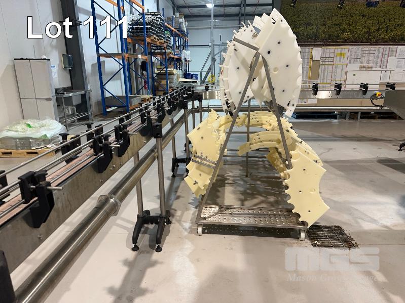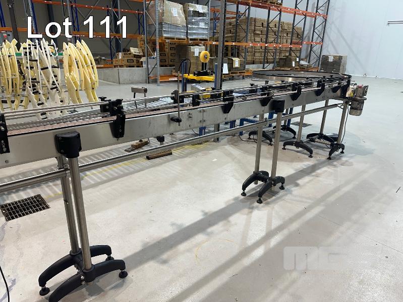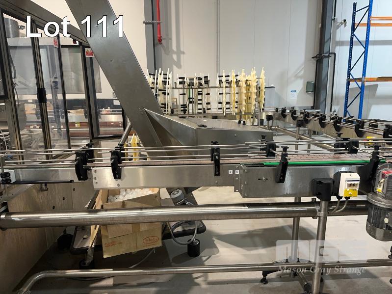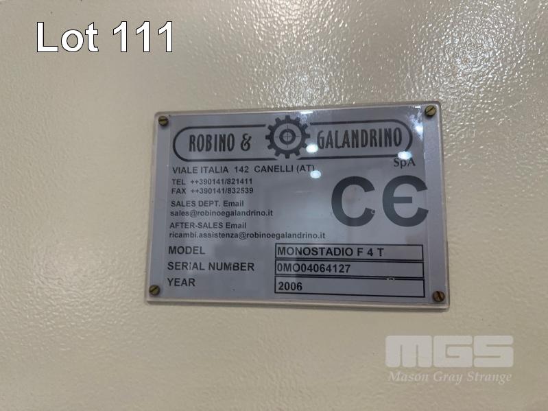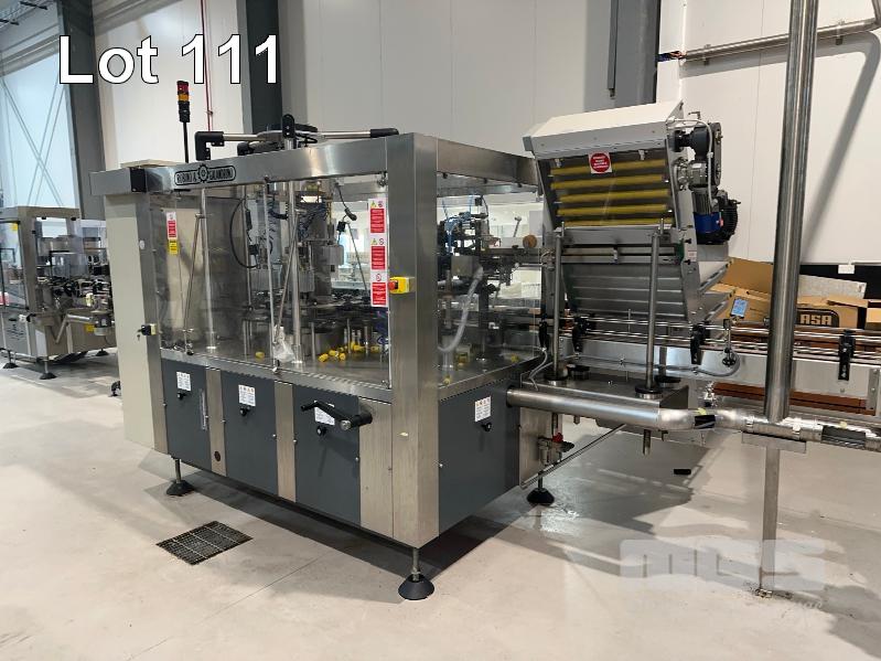 AUTOMATED BOTTLING/FILL LINE TO INCLUDE ROTARY BOTTLE DELIVERY TABLE TIRELLI 6 HEAD FILLING STATION MOD:MONOBLOC 6P + IRO S/NO: M1095 BUILT: 2006 WITH SARG AUTO CAPPER & BULK BIN/ELEVATOR MOD: ENF-300 S/NO: 06/005754 TRAVELLING ON CONTINUOUS SLAT CONVEYOR STAINLESS STEEL BODY OFF CHUTE BOTTLE TABLE APPROX 15m CONVEYOR LINE POWER TO ROBINO & GALANDRINO AUTO CAP COVER & SHRINK WRAPPER MOD: MONOSTADIOF4T DOM: 2006 S/NO: 0M004064127 WITH ROBINO & GALANDRINO MULTI CAP AUTO LOADER 4 TIER, MANUAL LOAD TO VARIABLE LANE CONVEYOR POWER FEEDING CAVAGNINI & GATTI AUTO LABELLER & CODE STAMPING MOD: CG/E103XPSP S/NO: A5310 DOM: 2006 WITH CODEMARK AUTO DATE CODE PRINTER MOD: A100 CONSOLE COUNTER FOR LINE OUT FEEDING CONVEYOR TO CIRCULAR DISPATCH STAND TO INCLUDE 4 x MOBILE RACKS OF BOTTLE SIZE TOOLING TO SUIT BOTTLE LINE