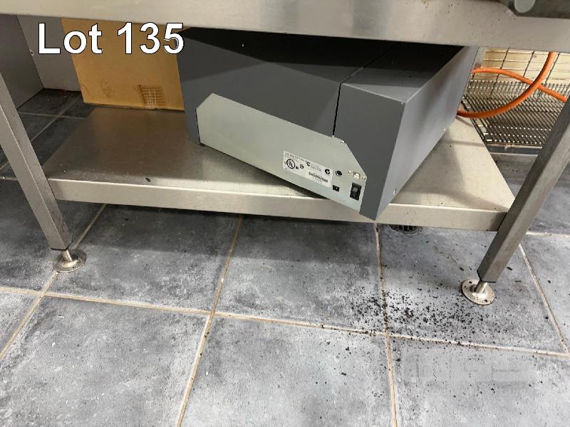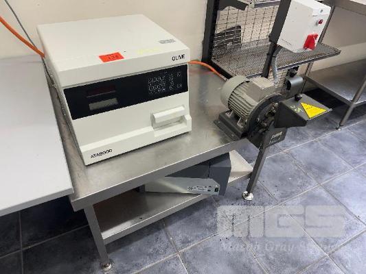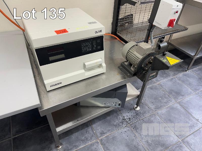 OLIVE ANALYSER, ATA8000 415V ON 2 TIER STAINLESS STEEL BENCH 800 x 1000mm AX FLOW PRODUCE GRINDER & COLOR LABEL PRINTER