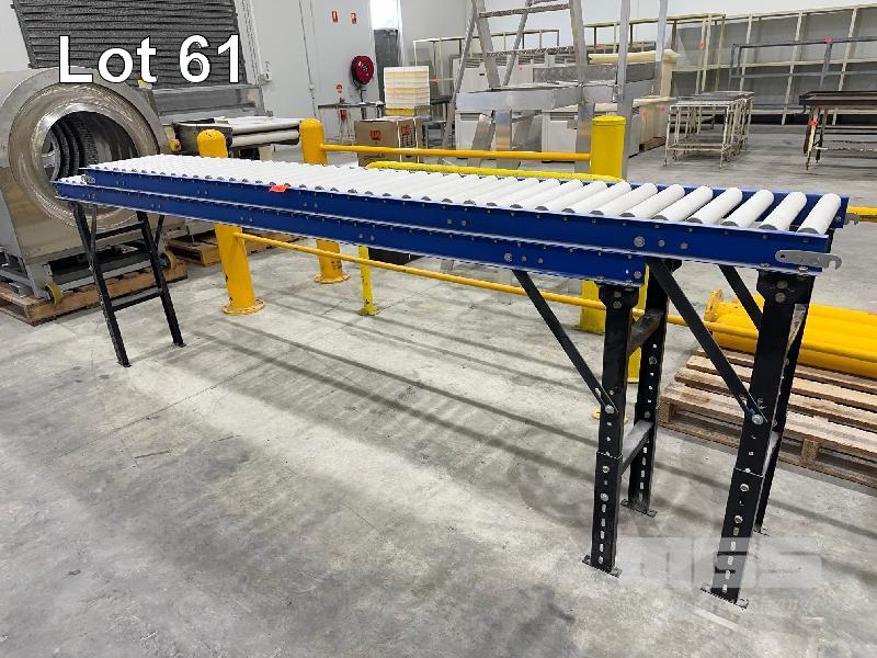 2 x FOOD GRADE ROLLER CONVEYOR SECTIONS, 3 x STANDS, ADJUSTABLE HEIGHT 2 x 380 (W) x 3000mm