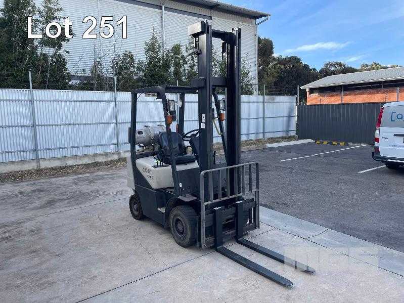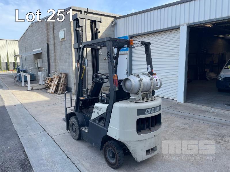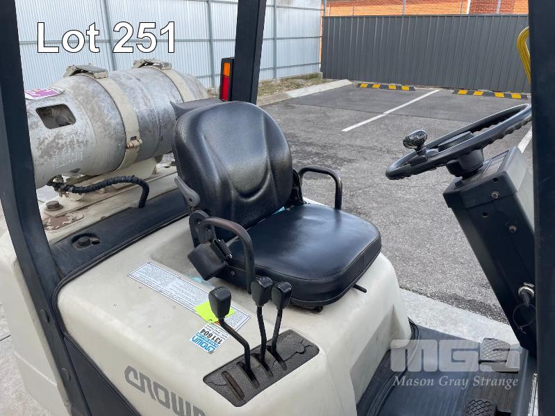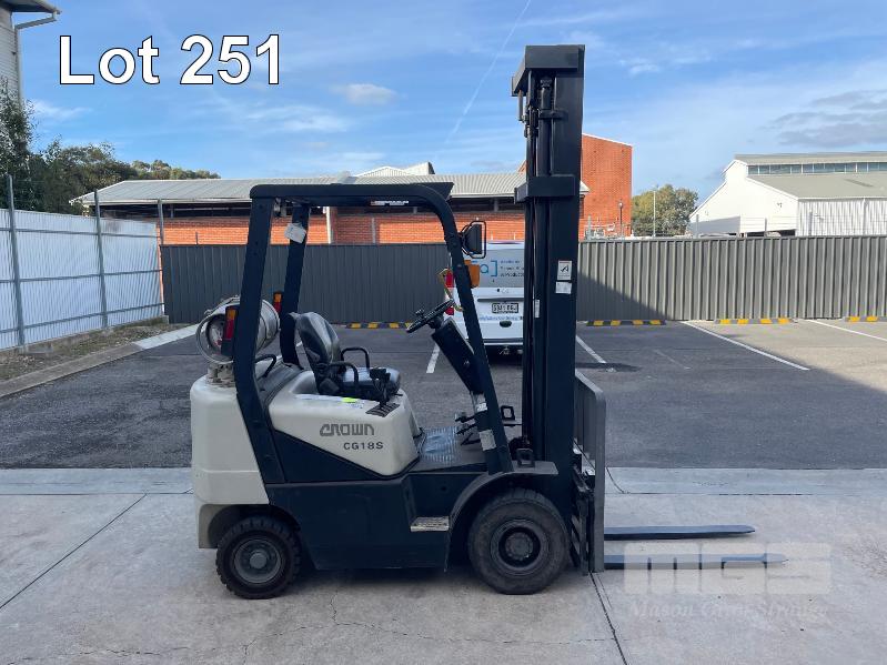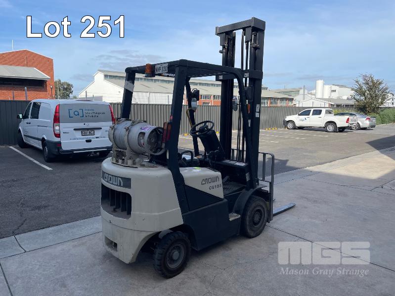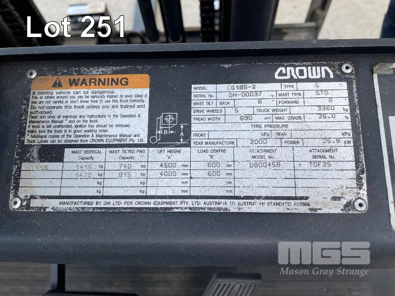 CROWN 1.5 TONNE FORKLIFT, MOD: CG18S-2, DOM: 2000 SERIAL: DH-00037, HOURS: 2,998 TILT & SIDESHIFT, SOLID TYRES, LPG, 2 STAGE MAST, MAX LIFT: 4500mm, MAST: 2800mm (H) LIFT CAP: 1,470kg, REGO: NVP 330