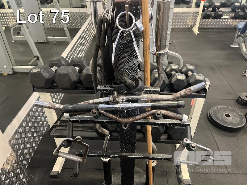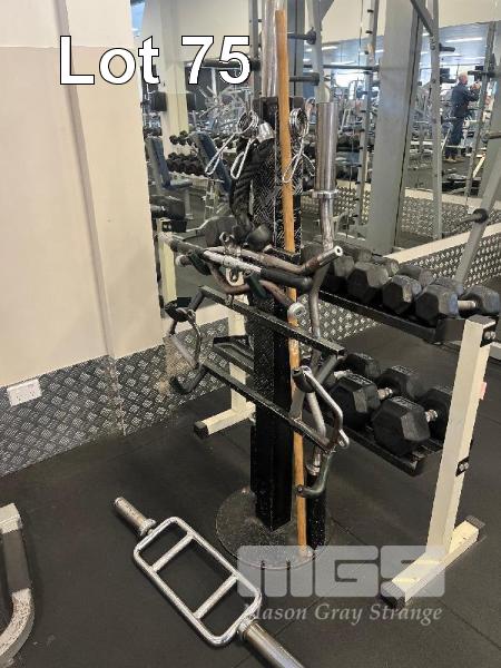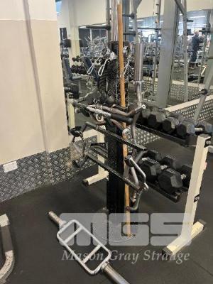 GYM STORAGE TREE WITH CABLE MACHINE ACCESSORIES, TRICEP BAR, CURL BAR ETC.