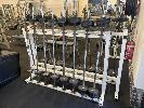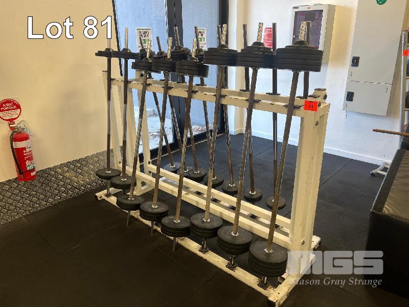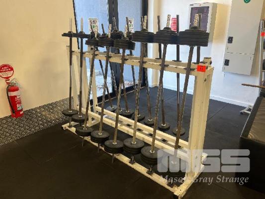 PAIR OF BARBELL RACKS WITH 16 x AUSTRALIAN BARBELL CO. BARBELLS, 10 TO 50kg