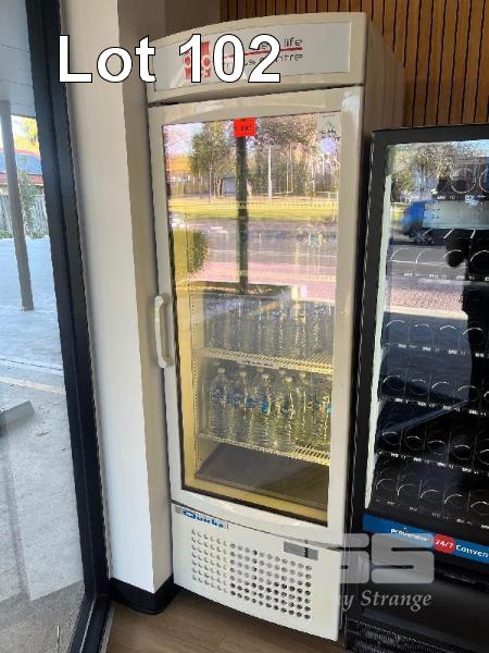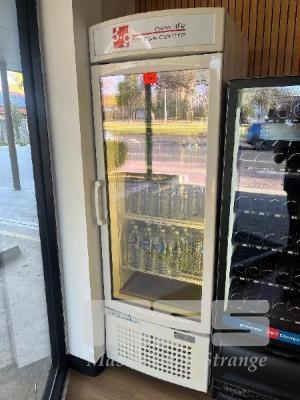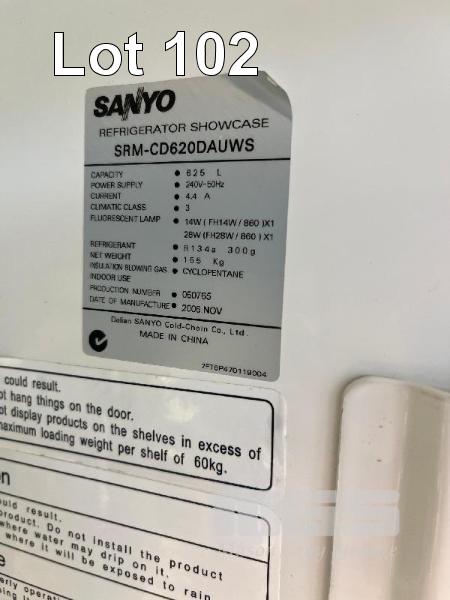 SANYO SINGLE DOOR UPRIGHT DISPLAY FRIDGE, DOM: 2006, 625L, ILLUMINATED, 240V 10AMP PLUG