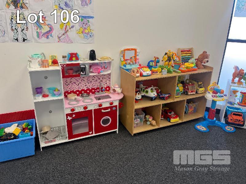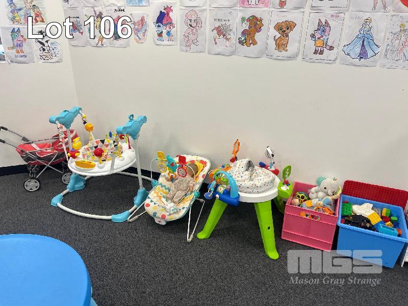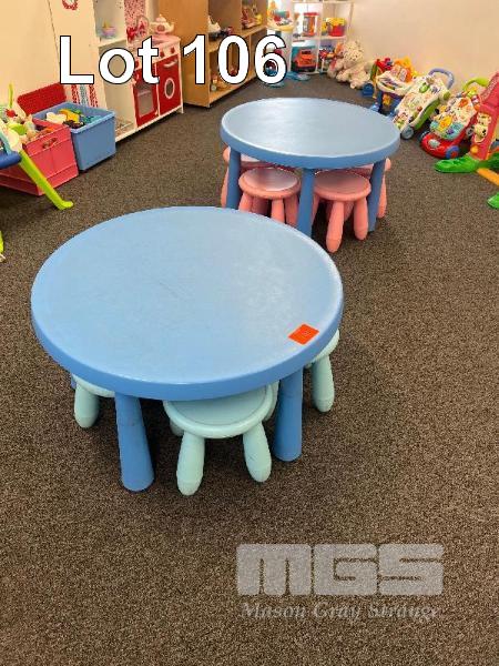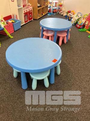 LARGE QUANTITY TODDLERS TOYS, 2 x PLASTIC CHILDREN'S TABLES 850mm WITH 10 x STOOLS