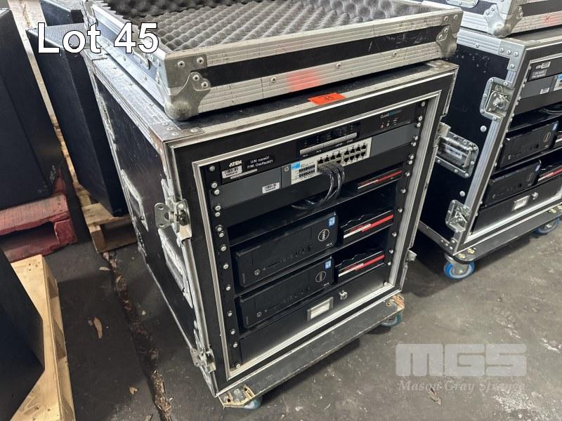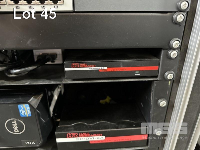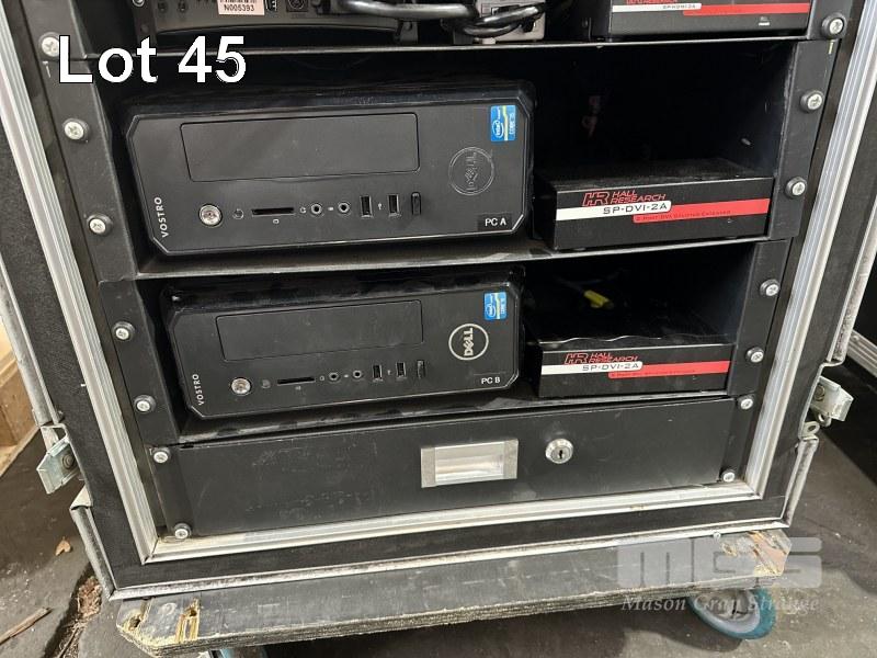MOBILE RACKMOUNT ROAD CASE, 65 x 60 x 67cm INC. - ATEN CUBIQ CS1644 KVM SWITCH - HP 1410-16G 16-PORT SWITCH, J9560A - HALL REASEARCH SP-HDMI-2A HDMI SPLITTER - EPIPHAN LECTURE RECORDER - AUSTRALIAN MONITOR AUDIO HUM ELIMINATOR - 2 x HALL RESEARCH SP-DVI-2A 2 PORT DVI SPLITTERS - 2 x DELL VOSTRO 270s, CORE i5 COMPUTERS