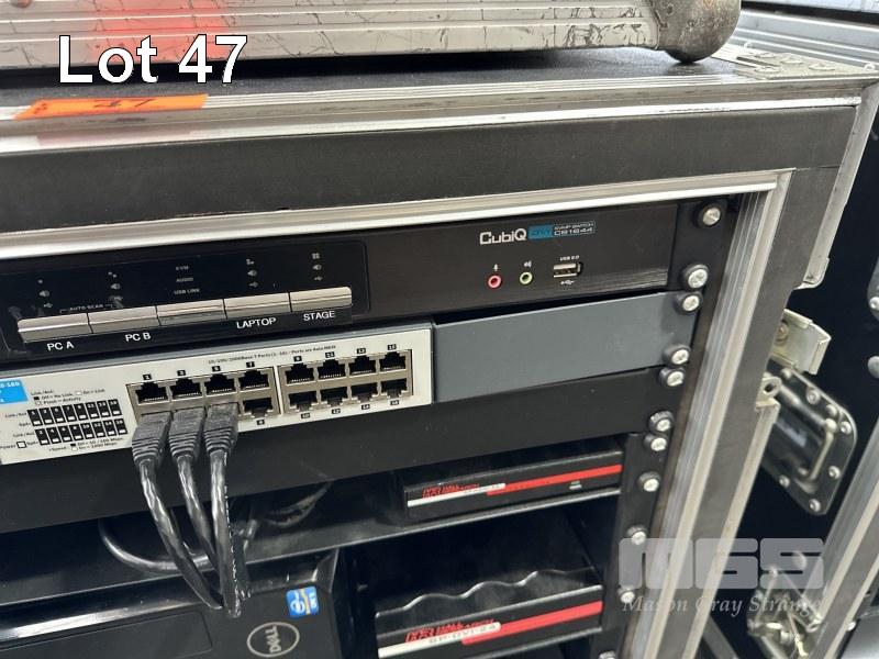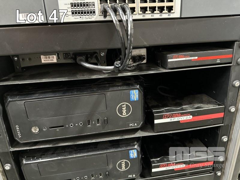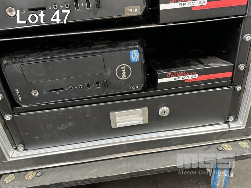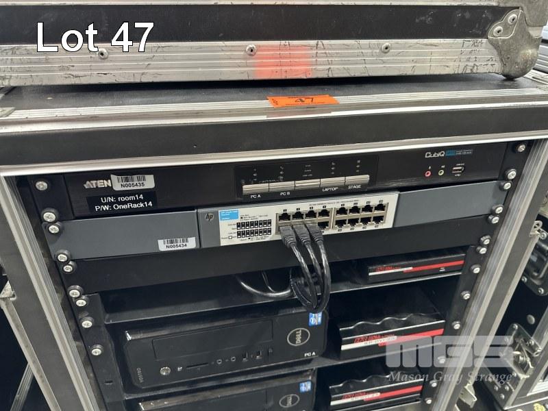 MOBILE RACKMOUNT ROAD CASE, 65 x 60 x 67cm INC. - ATEN CUBIQ CS1644 KVM SWITCH - HP 1410-16G 16-PORT SWITCH, J9560A - HALL REASEARCH SP-HDMI-2A HDMI SPLITTER - EPIPHAN LECTURE RECORDER - AUSTRALIAN MONITOR AUDIO HUM ELIMINATOR - 2 x HALL RESEARCH SP-DVI-2A 2 PORT DVI SPLITTERS - 2 x DELL VOSTRO 270s, CORE i5 COMPUTERS