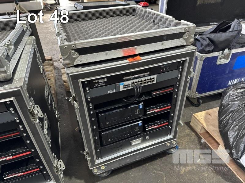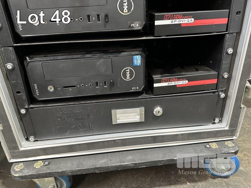 MOBILE RACKMOUNT ROAD CASE, 65 x 60 x 67cm INC. - ATEN CUBIQ CS1644 KVM SWITCH - HP 1410-16G 16-PORT SWITCH, J9560A - HALL REASEARCH SP-HDMI-2A HDMI SPLITTER - EPIPHAN LECTURE RECORDER - AUSTRALIAN MONITOR AUDIO HUM ELIMINATOR - 2 x HALL RESEARCH SP-DVI-2A 2 PORT DVI SPLITTERS - 2 x DELL VOSTRO 270s, CORE i5 COMPUTERS