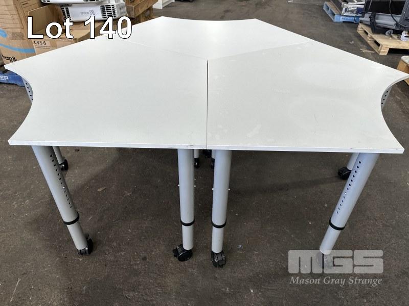3 x MOBILE PENTAGON OFFICE TABLES, WHITE LAMAINTE TOP, HEIGHT ADJUSTABLE WITH LOCKABLE CASTORS EACH 80 x 80 x 64cm, ADJUSTABLE FROM 56cm TO 82cm HIGH