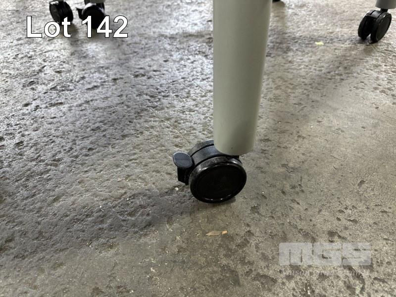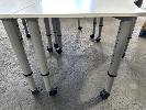 3 x MOBILE PENTAGON OFFICE TABLES, WHITE LAMAINTE TOP, HEIGHT ADJUSTABLE WITH LOCKABLE CASTORS EACH 80 x 80 x 64cm, ADJUSTABLE FROM 56cm TO 82cm HIGH