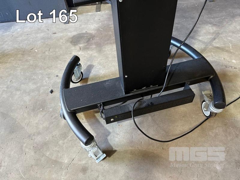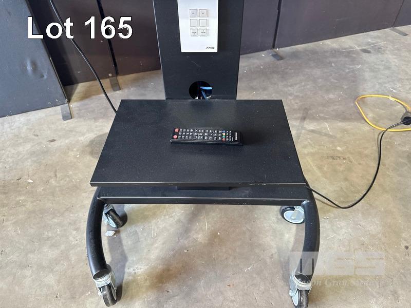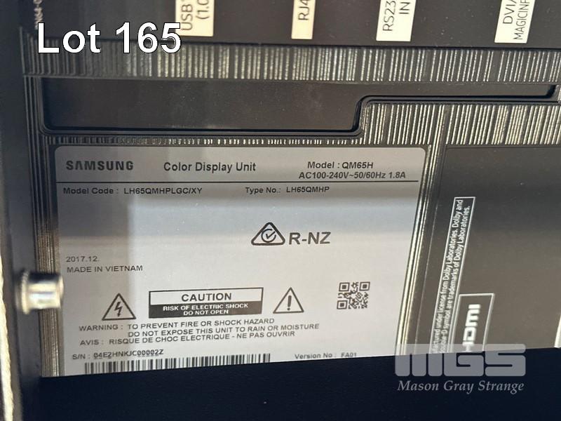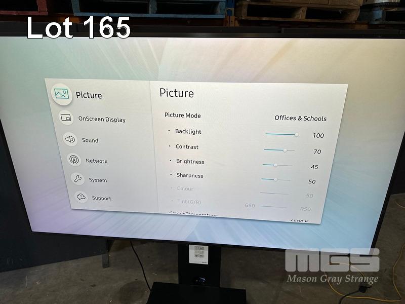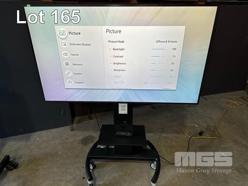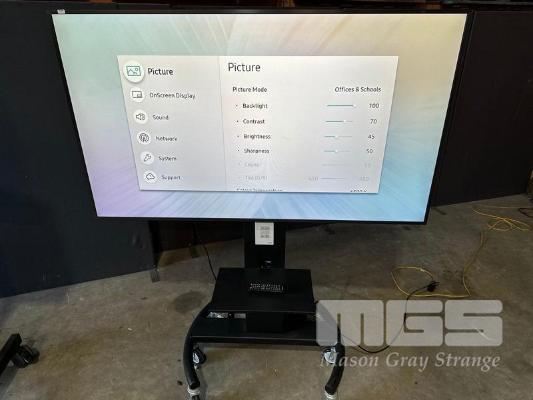 SAMSUNG QM65H SERIES 65" UHD COMMERCIAL LED LCD DISPLAY, LH65QMHPLGC/XY ON AMM MOBILE STAND WITH NETWORK SWITCH & POWER BOARD (NOTE: SCRATCHES ON SCREEN) S/N:04E2HNKJC00002Z
