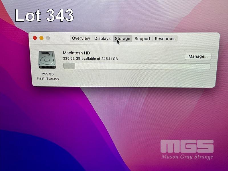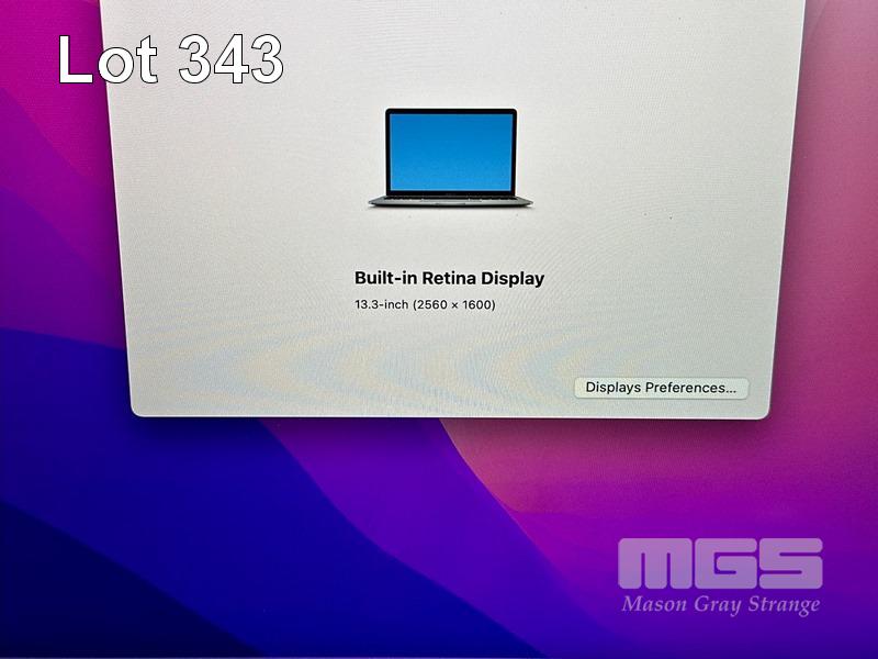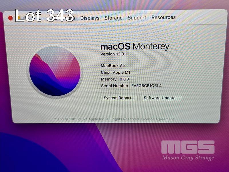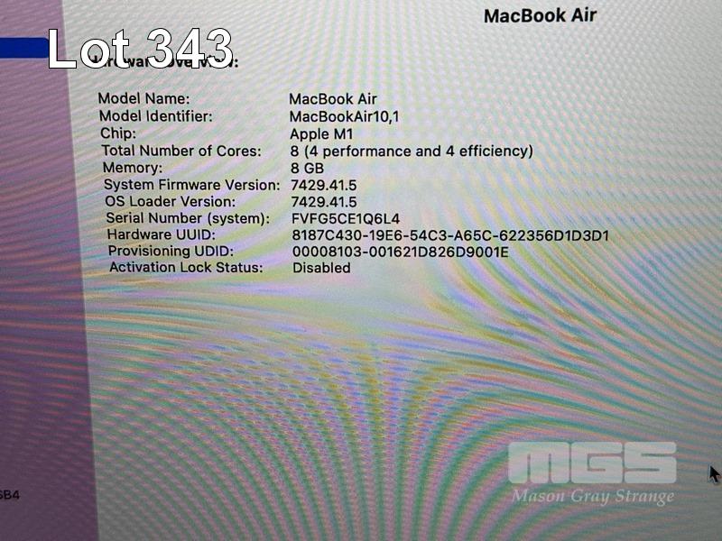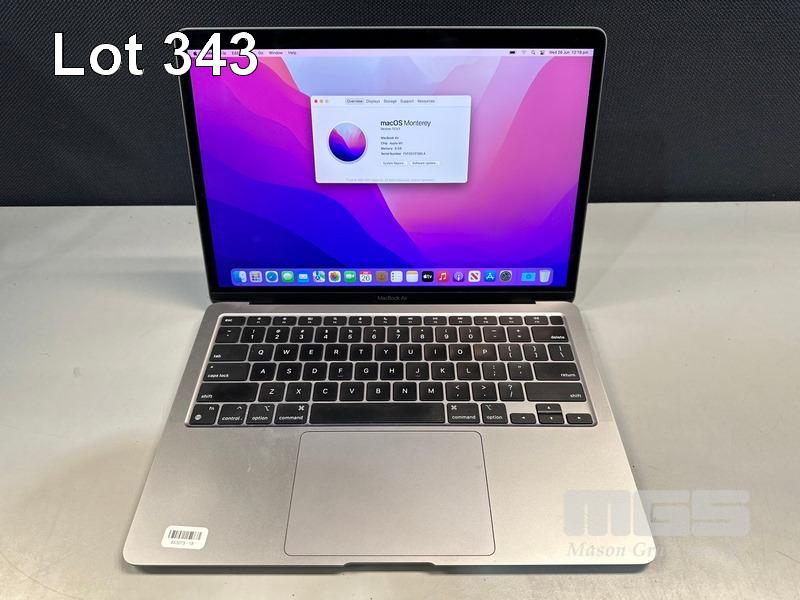 LAPTOP, APPLE MACBOOK AIR (A2337), MGN63X/A, APPLE M1 8 CPU/7 GPU, 8GB RAM, 256GB SSD, 13.3" RETINA DISPLAY (2560x1600), Wi-Fi, BLUETOOTH, MAC OS 12 INSTALLED (NO USB-C POWER SUPPLY) (NOTE: MINOR MARKS ON SCREEN) S/N:FVFG5CE1Q6L4