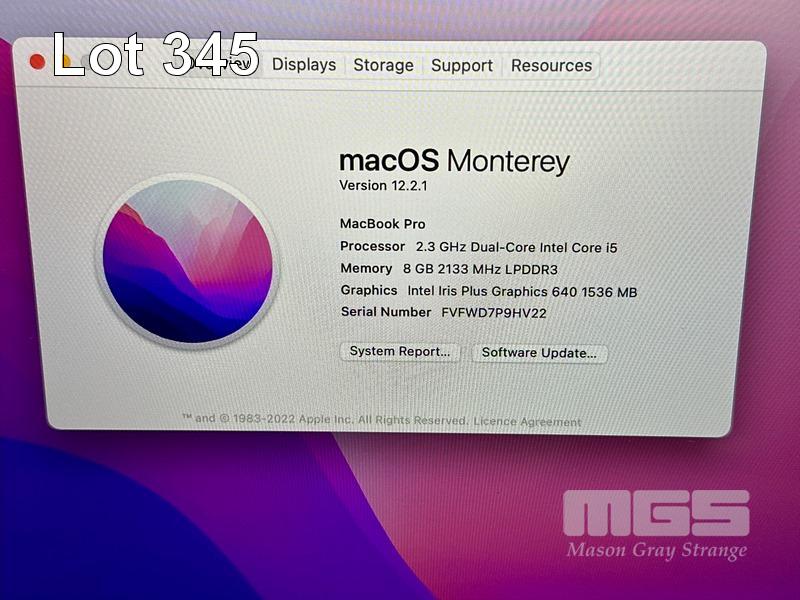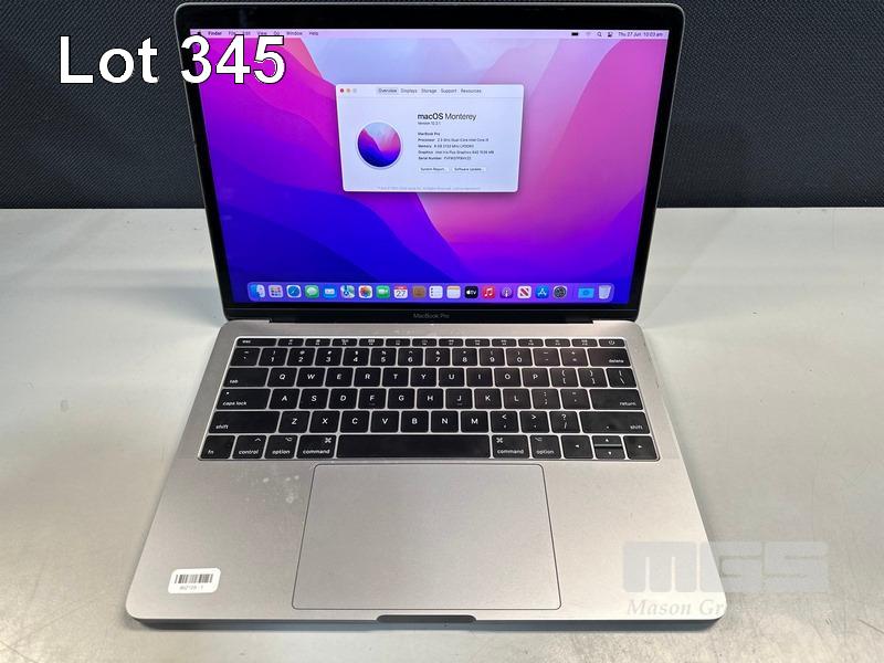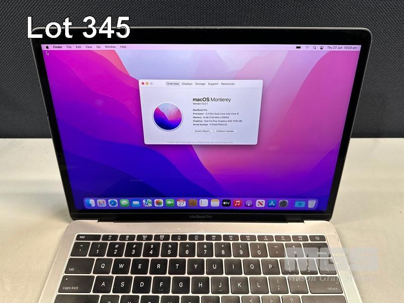 LAPTOP, APPLE MACBOOK PRO (A1708), CORE i5 7360U (7TH GEN) @ 2.3GHz, 8GB DDR3 RAM, 128GB SSD, 13.3" RETINA DISPLAY (2560x1600), INTEL IRIS PLUS GRAPHICS 640, Wi-Fi, BLUETOOTH, MAC OS 12 INSTALLED (NO USB-C POWER SUPPLY) (NOTE: MARKS ON SCREEN) S/N:FVFWD7P9HV22