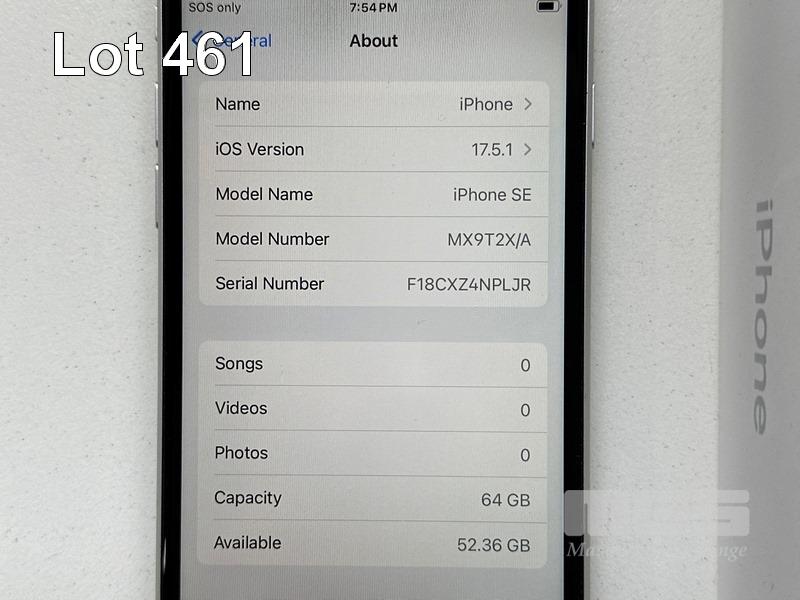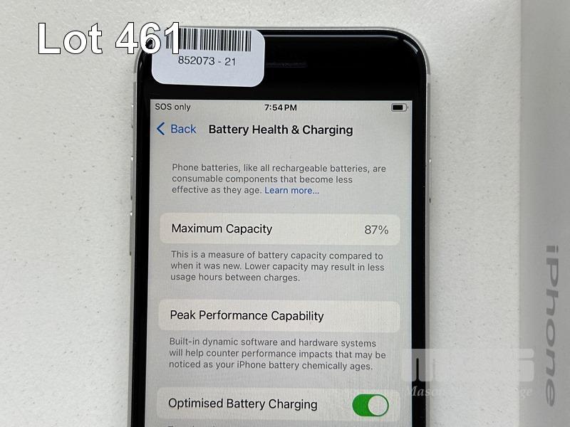 APPLE iPHONE SE, 64GB, WHITE, MODEL MX9T2X/A, A2296, BATTERY HEALTH 87% (NO CABLE, NO CHARGER) S/N:F18CXZ4NPLJR