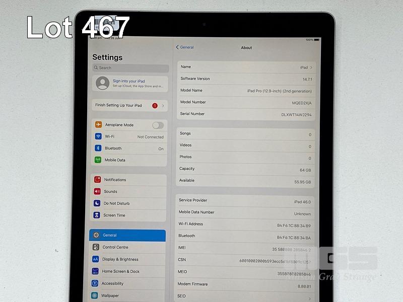 APPLE iPAD PRO 12.9 INCH, 2ND GEN, 64GB, Wi-Fi, CELLULAR, SPACE GREY, MODEL MQED2X/A, A1671 (NO CABLE, NO CHARGER) S/N:DLXWT14WJ294