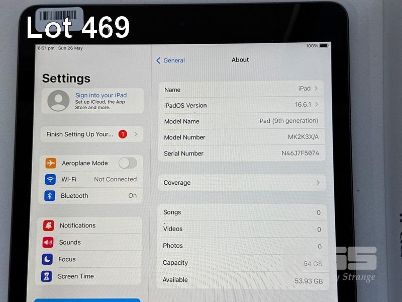 APPLE iPAD 9TH GEN, 64GB, Wi-Fi, SPACE GREY, MODEL MK2K3X/A, A2602 WITH CABLE & CHARGER S/N:N46J7F5074