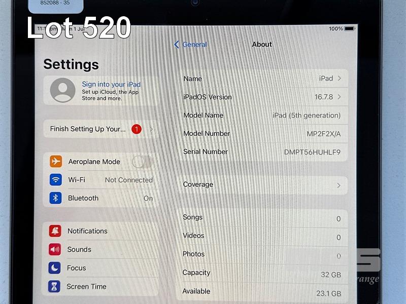 APPLE iPAD 5TH GEN, 32GB, Wi-Fi, SPACE GREY, MODEL MP2F2X/A, A1822 (NO CABLE, NO CHARGER) S/N:DMPT56HUHLF9