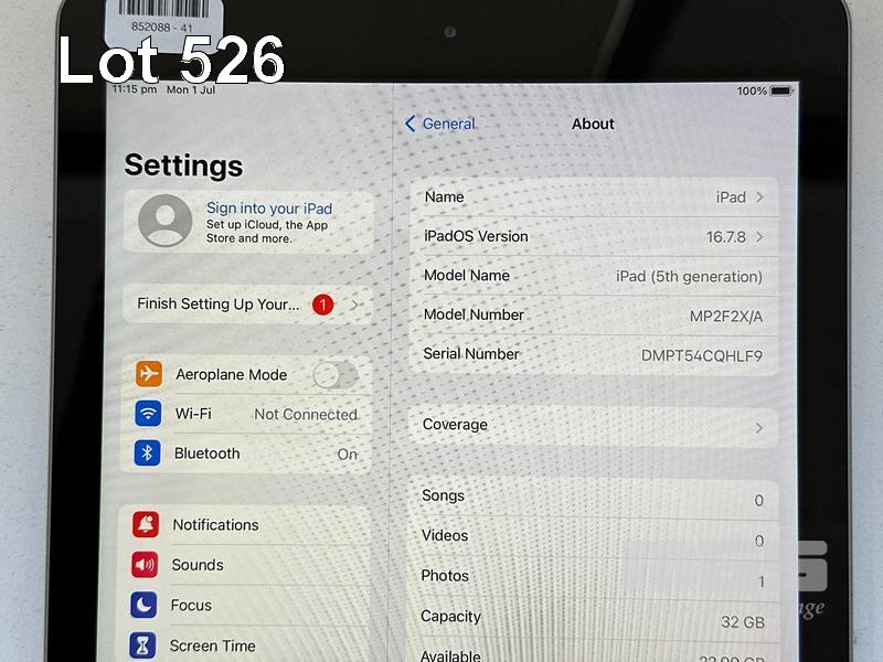 APPLE iPAD 5TH GEN, 32GB, Wi-Fi, SPACE GREY, MODEL MP2F2X/A, A1822 (NO CABLE, NO CHARGER) S/N:DMPT54CQHLF9