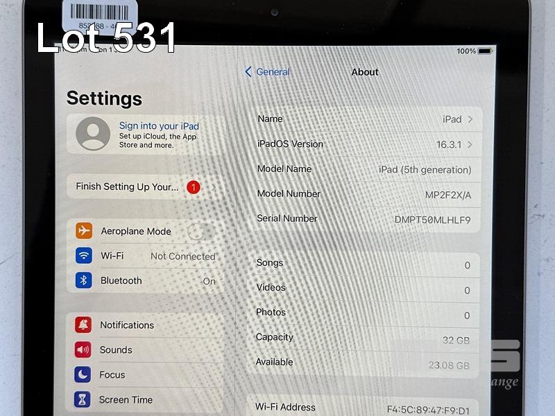 APPLE iPAD 5TH GEN, 32GB, Wi-Fi, SPACE GREY, MODEL MP2F2X/A, A1822 (NO CABLE, NO CHARGER) S/N:DMPT50MLHLF9
