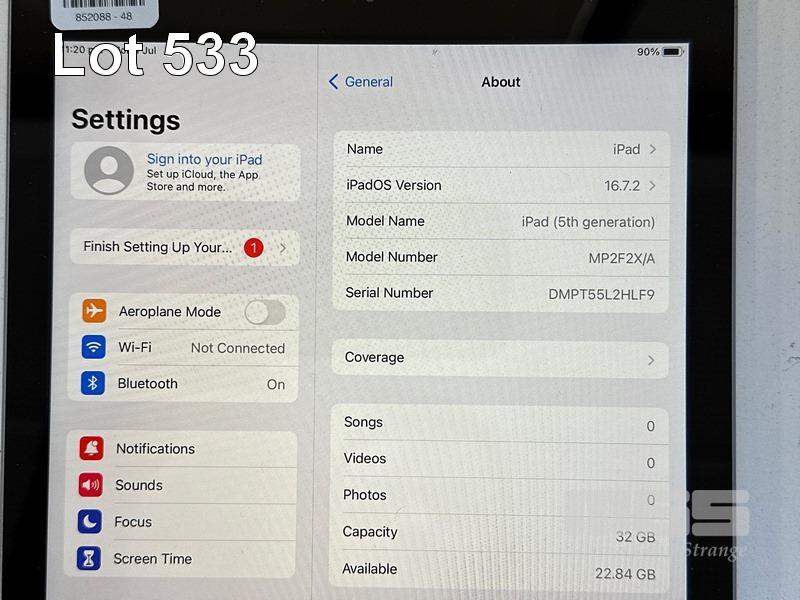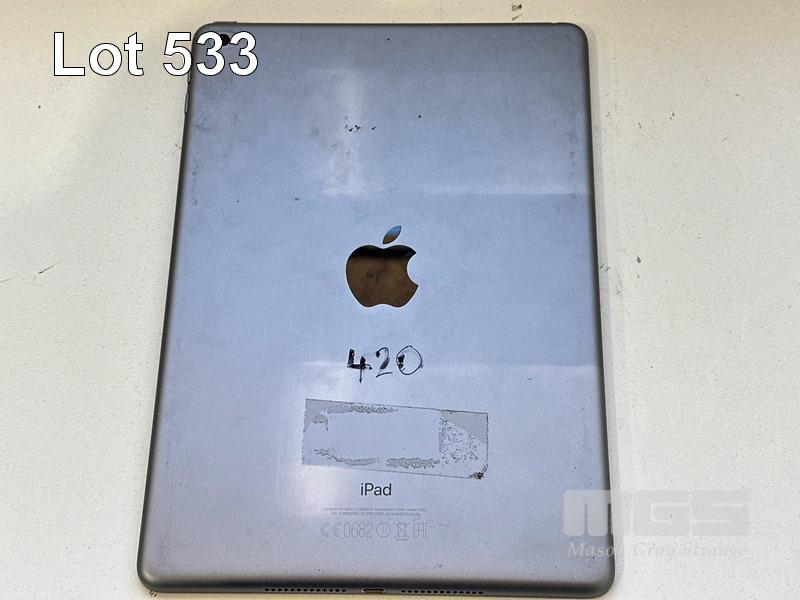 APPLE iPAD 5TH GEN, 32GB, Wi-Fi, SPACE GREY, MODEL MP2F2X/A, A1822 (NO CABLE, NO CHARGER) (NOTE: MINOR DAMAGE) S/N:DMPT55L2HLF9