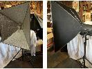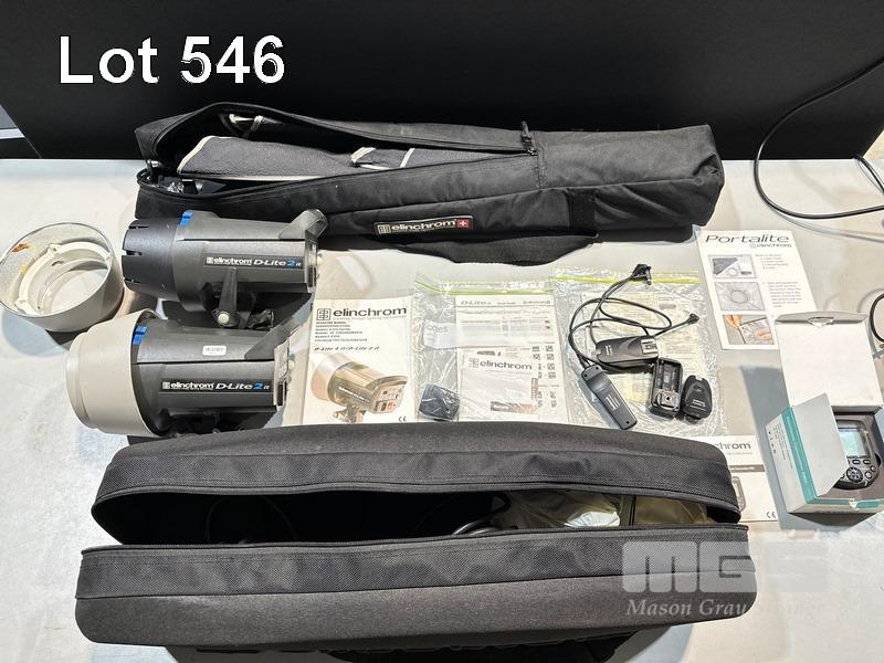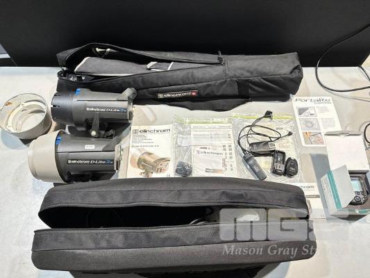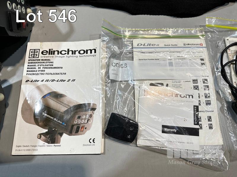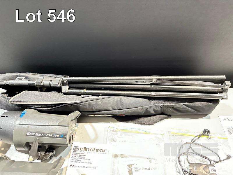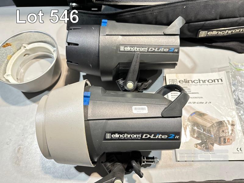 2 x ELINCHROM D-LITE 2 IT FLASH UNITS WITH TRIPODS, ELINCHROM PORTALITE SOFTBOXES, ELINCHROM TRANSMITTER PRO, HAHNEL COMBI TF REMOTE RECEIVER