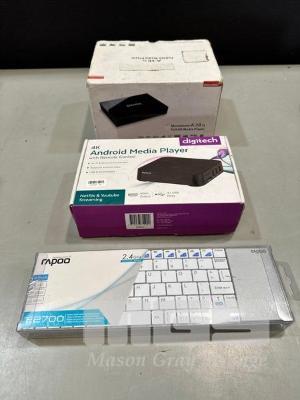 DIGITECH 4K ANDROID MEDIA PLAYER, NOONTEC A3IIS FULL HD MEDIA PLAYER, RAPOO E2700 WIRELESS TOUCHPAD KEYBOARD