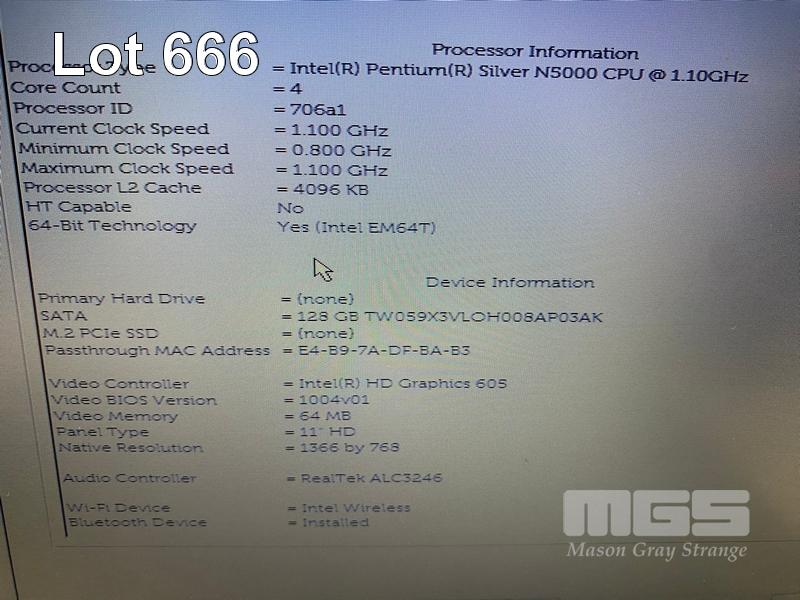 LAPTOP, DELL LATITUDE 3190, PENTIUM SILVER N5000 @ 1.1GHz, 4GB DDR4 RAM, 128GB M.2 SSD, 11.6" WIDESCREEN (1366x768), INTEL UHD GRAPHICS 605, Wi-Fi, BLUETOOTH, WINDOWS 11 PRO EDUCATION INSTALLED & POWER SUPPLY S/N:CZF76S2