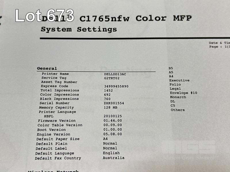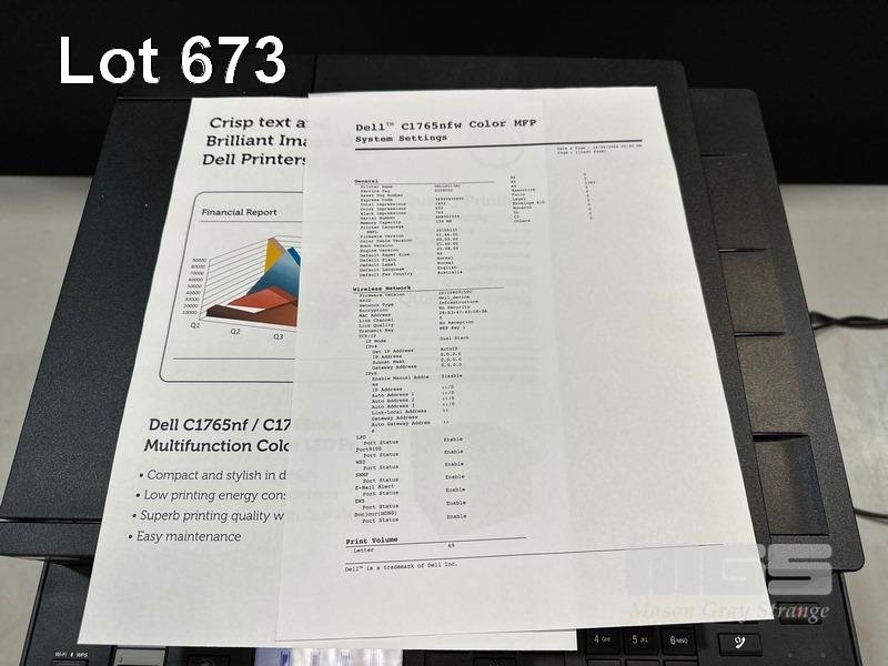 PRINTER, DELL C1765nfw MFC COLOUR LASER, USB, NETWORK, 692 COLOUR & 760 B&W PAGES (TEST PAGE ATTACHED) S/N:G2TRT02
