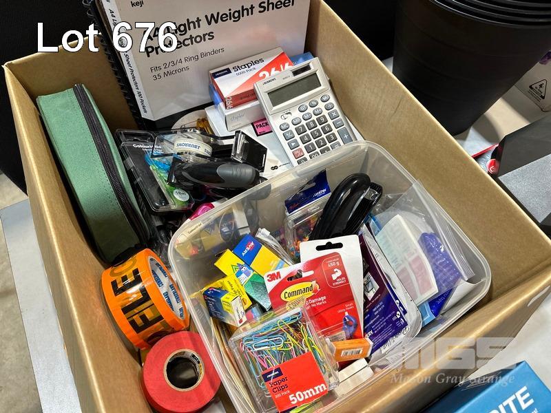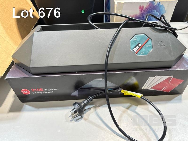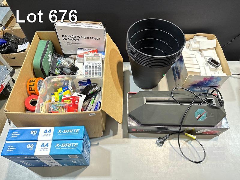 QTY ASST STATIONERY, FIRST AID KIT, A4 PAPER, WASTE BINS, IBICO THERMAL BINDING MACHINE, LED LIGHT KEY RINGS