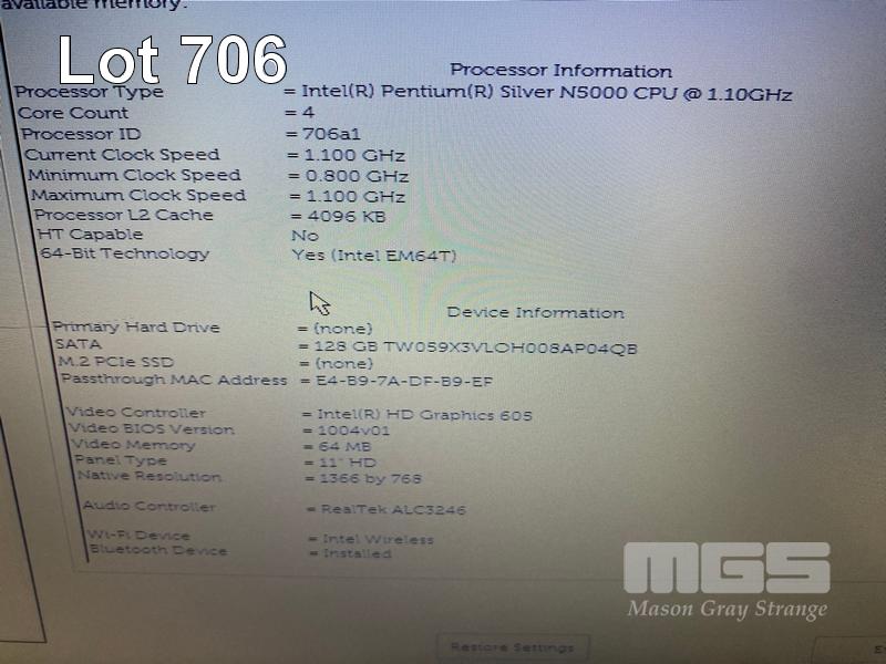 LAPTOP, DELL LATITUDE 3190, PENTIUM SILVER N5000 @ 1.1GHz, 4GB DDR4 RAM, 128GB M.2 SSD, 11.6" WIDESCREEN (1366x768), INTEL UHD GRAPHICS 605, Wi-Fi, BLUETOOTH, WINDOWS 11 PRO EDUCATION INSTALLED & POWER SUPPLY (NOTE: BATTERY NOT CHARGING, SCRATCH ON SCREEN) S/N:6ZF76S2