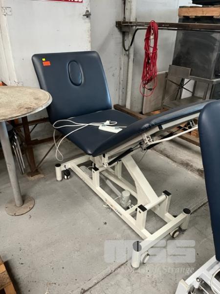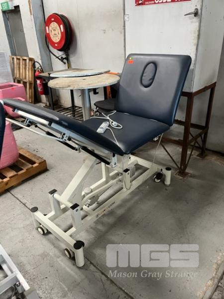 CONFYCARE TREATMENT TABLE, ADJUSTABLE HEIGHT, INCLINE & LEG REST, 240V 10 AMP PLUG BLUE VINYL, MOBILE CASTOR WHEELS, FOOT OPERATED CONTROLS