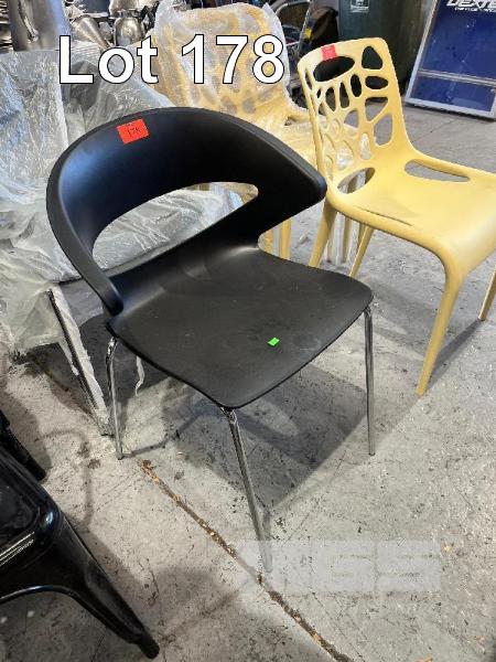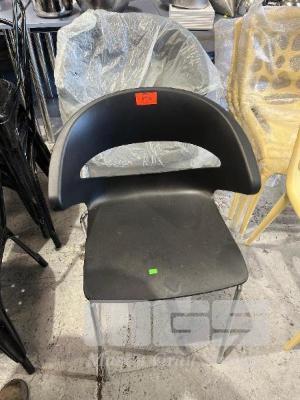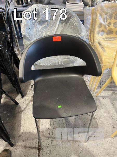 4 x STACKABLE CAFE CHAIRS, BLACK PLASTIC, CHROME FRAME, NEW