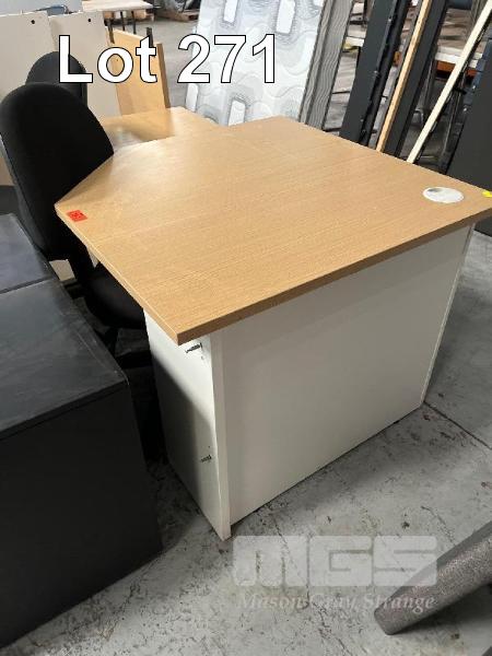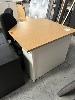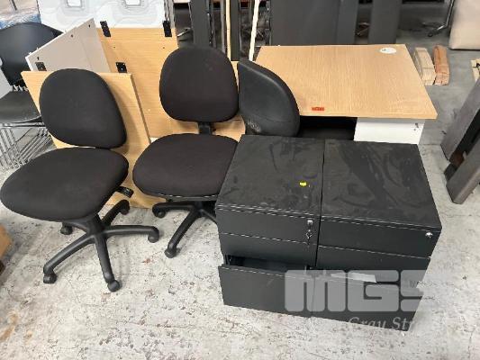 L-SHAPE DESK, BEECH LAMINATE (DISMANTLED), 2 x MOBILES & 3 x BLACK FABRIC OFFICE CHAIRS