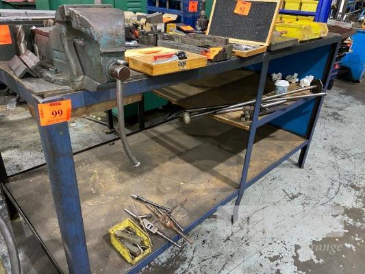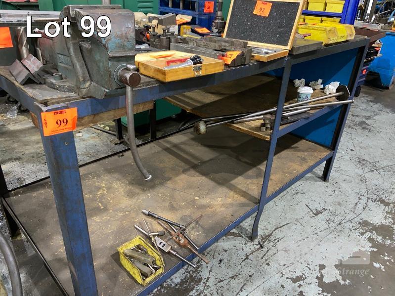 HEAVY DUTY STEEL BENCH, PARTICLEBOARD TOP, SHELF, 1800 x 900 x 850mm & 4" VICE