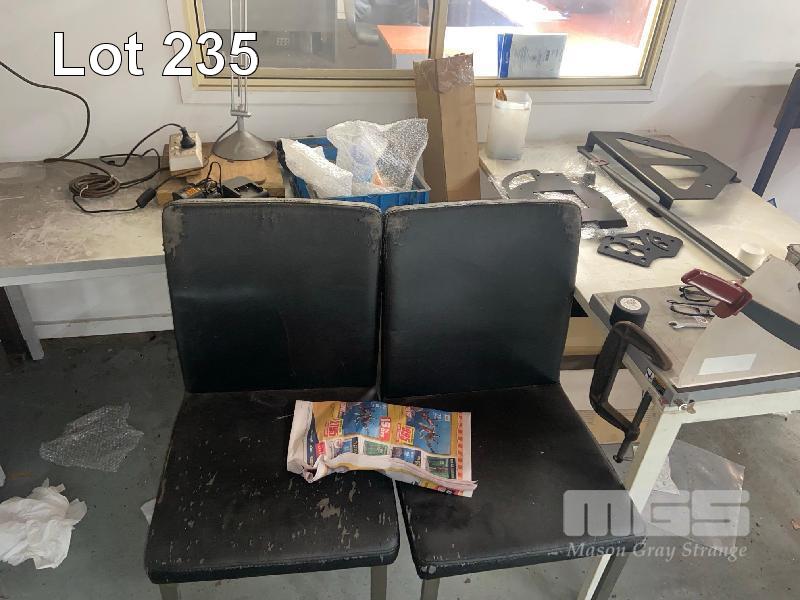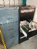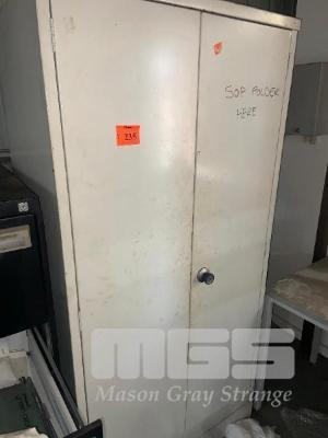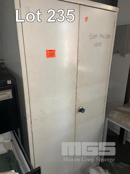 STEEL STOCK CUPBOARD, 2 DOOR, 2 x STEEL 4 DRAWER FILING CABINETS, 2 x WORK DESKS & 2 x CHAIRS