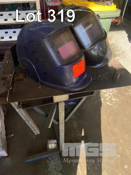 WELDING STAND, 2 x AUTO HEAD SHIELDS, LEATHER COAT & GLOVES