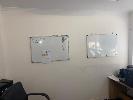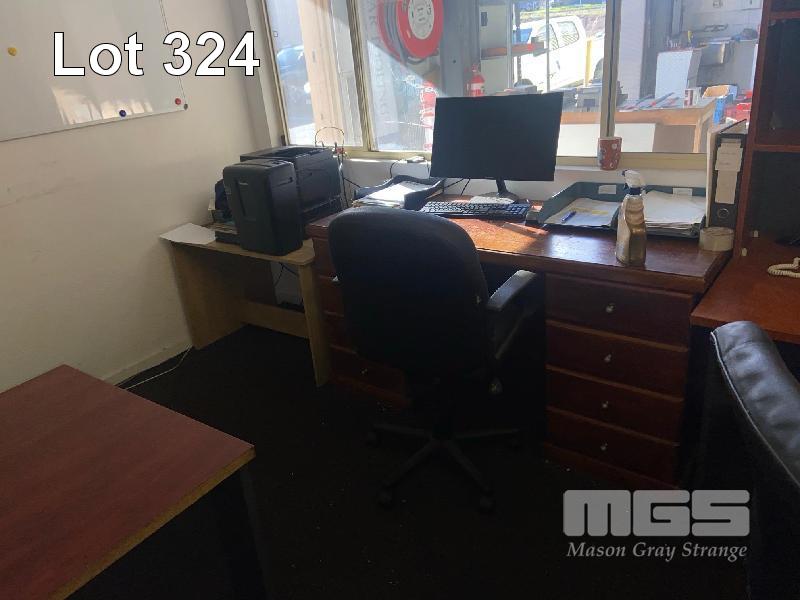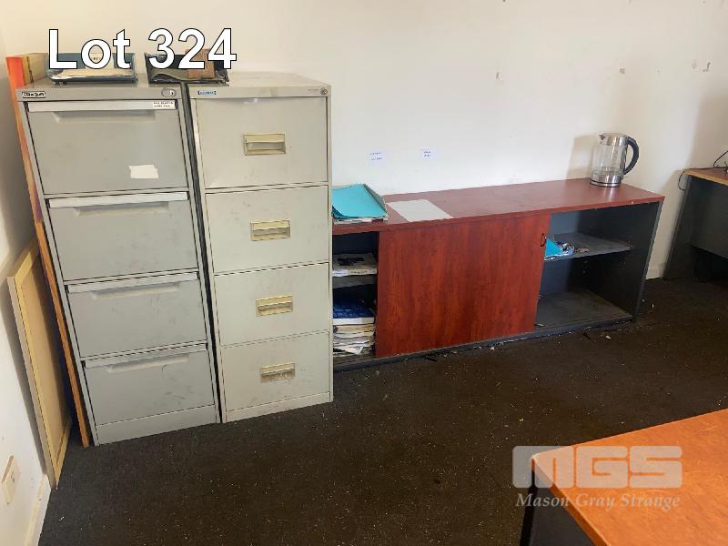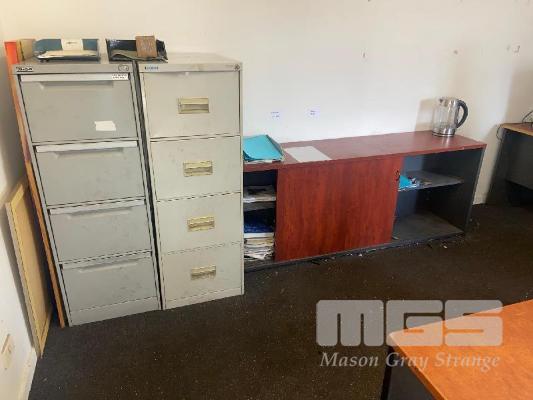 CONTENTS OF OFFICE INCLUDING, 3 x DESKS, 1 x TABLE, 2 x OFFICE CHAIRS, HEATER, VACUUM CLEANER, 2 x STEEL 4 DRAWER FILING CABINETS, CREDENZA & WHITEBOARDS