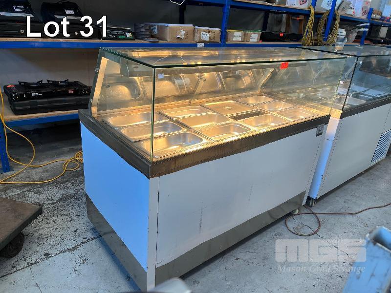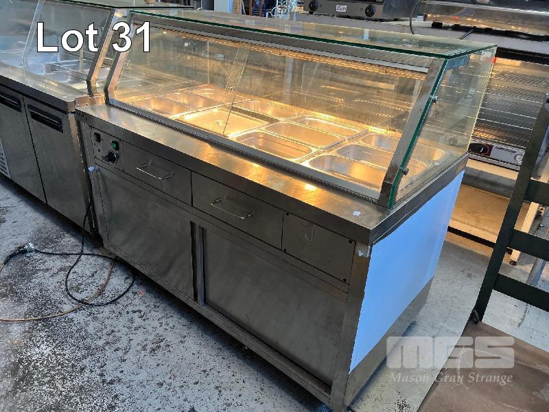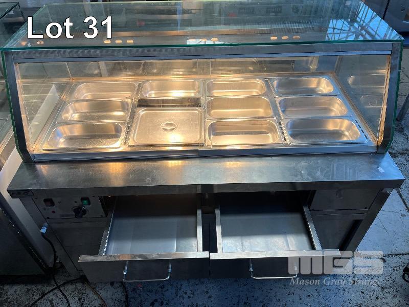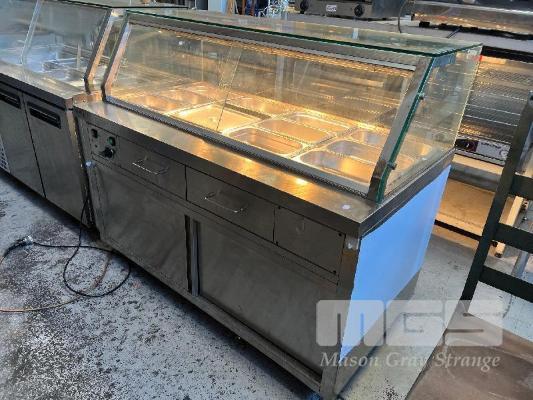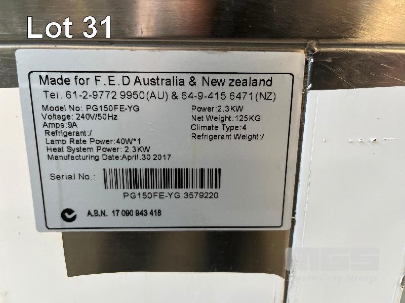HEATED BAIN MARIE FOOD DISPLAY, FED MOD: PG150FE-YG, DOM: 2017, S/NO: PG150-YG, 4 x OVERHEAD HEAT LAMPS, CASTOR WHEELS, 11 x GASTRONORM TRAYS, 240V 10 AMP PLUG