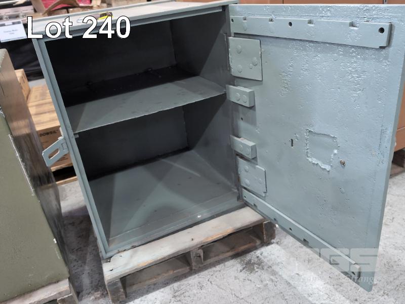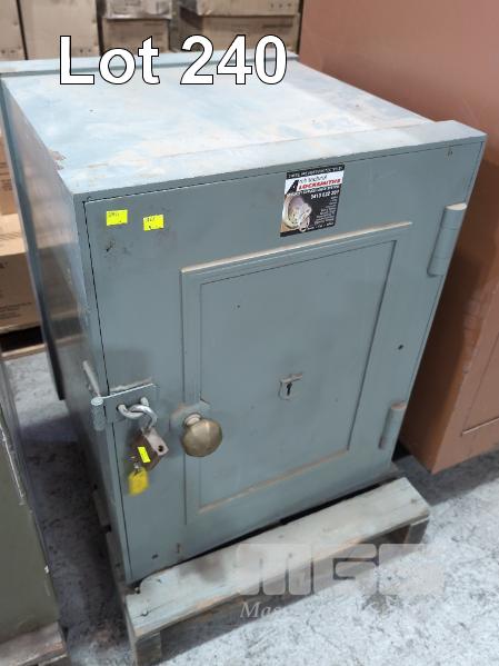 VINTAGE MILNER SAFE. ORIGNAL LOCK MISSING NOW LOCKS WITH PADLOCK HASP & STAPLE. PADLOCK & KEY PROVIDED. SUITABLE FOR PISTOL & AMMO STORAGE. 610 X 610 X 760 MM (W D H). WEIGHT 300 KG. 30 MINUTE FIRE RATING.