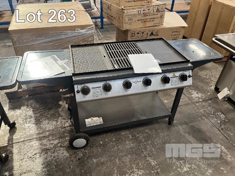 GRILLMASTER MOBILE FLAT TOP GAS BBQ 6-BURNER WITH TROLLEY. NEW IN BOX. ORP $699