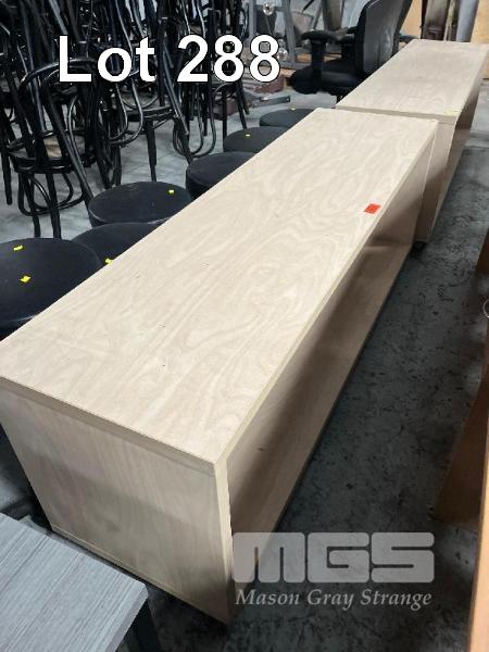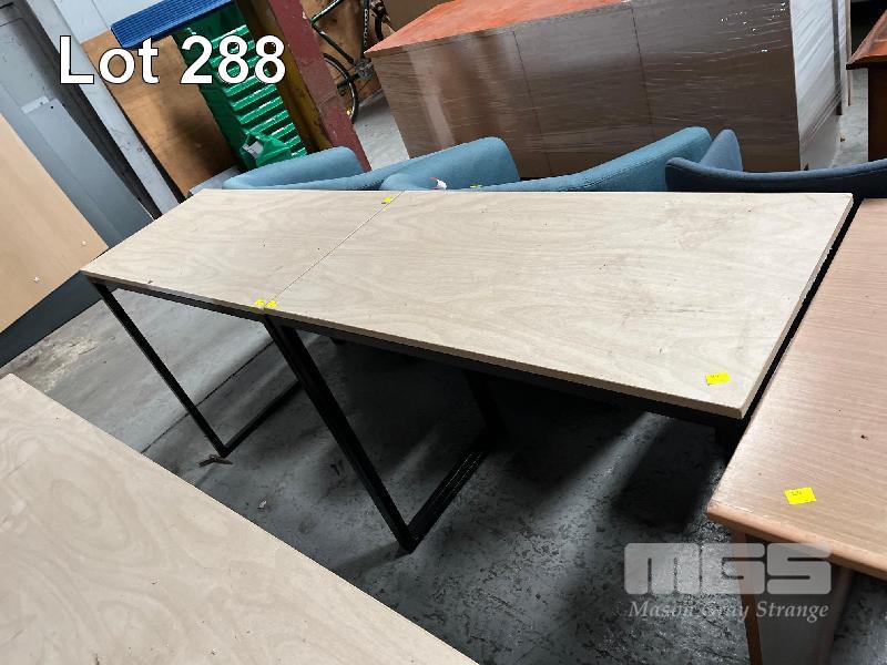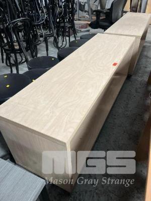 2 x MOBILE SHOP DISPLAY, EACH 1800 x 500mm & 2 x DISPLAY TABLES, BEECH LAMINATE