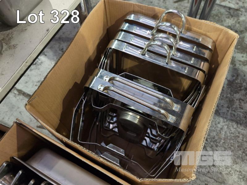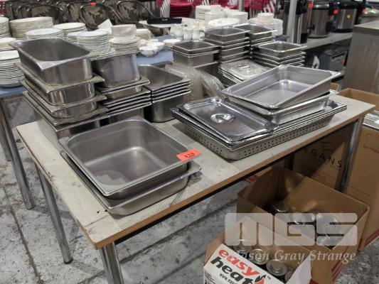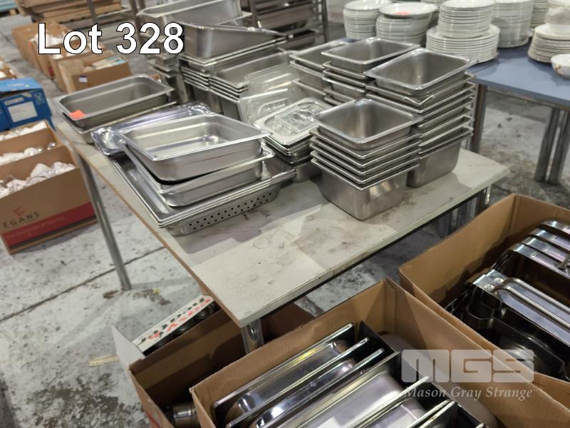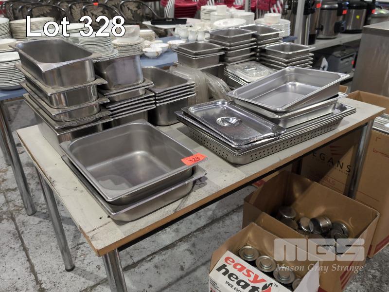 COLLECTION ASSORTED STEAM TRAYS, LIDS & CHAFFING PANS, STANDS & CANDLES (1 X TABLE & 3 X BOXES)