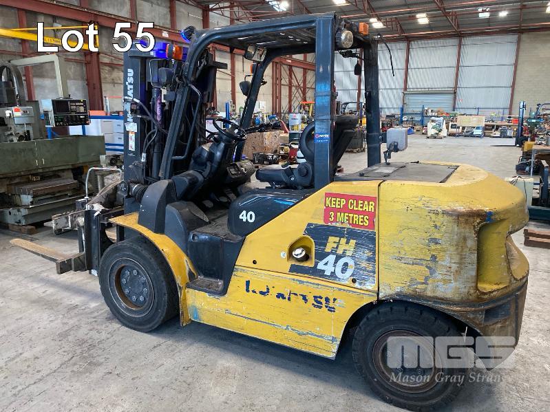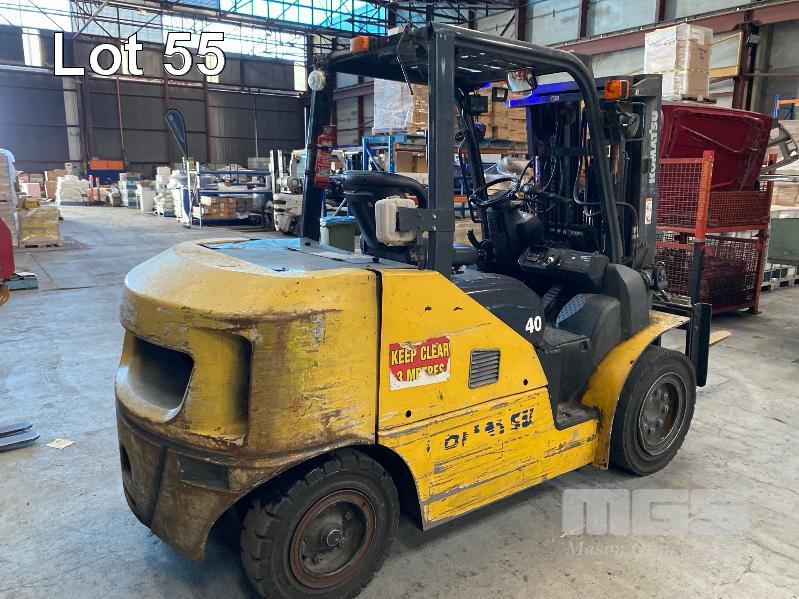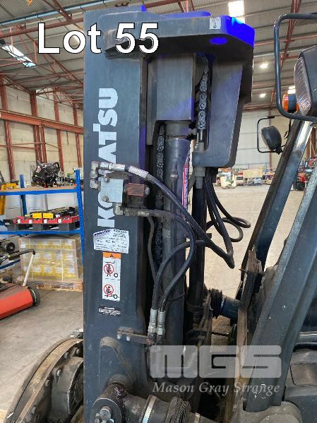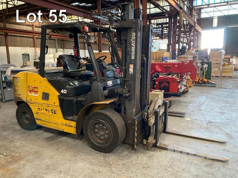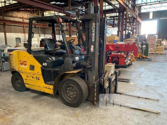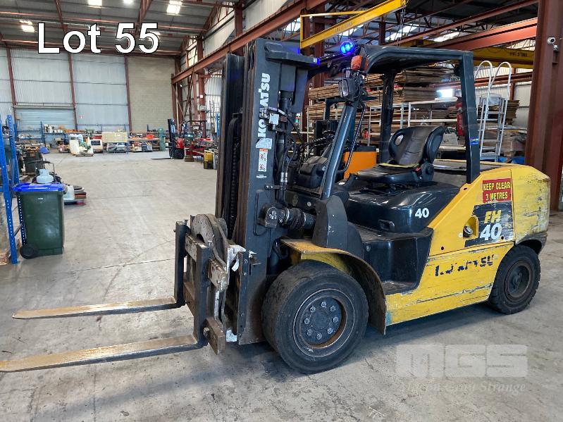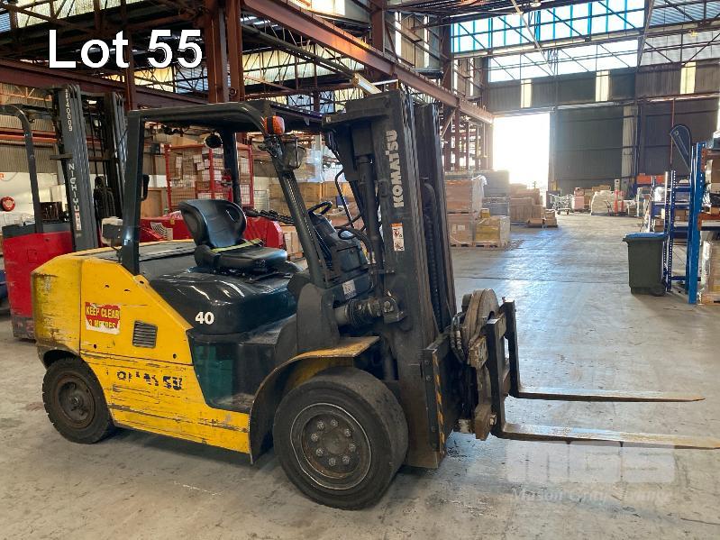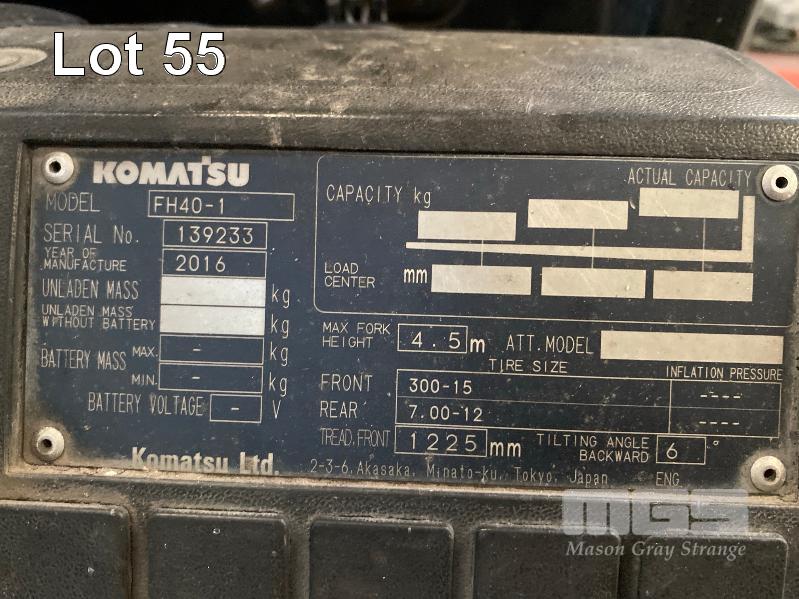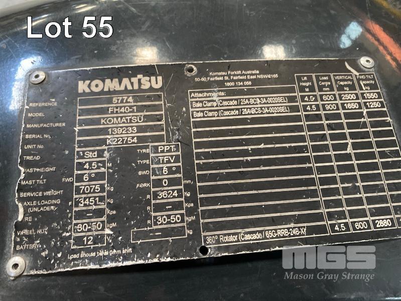 2016 KOMATSU FORKLIFT MOD: FH40-1 S/NO: 139233 ASSET NO: VFL00557 3 STAGE MAST ROTARY TYNE ATTACHMENT 4 CYLINDER DIESEL ENGINE HOURS: 12,366 SHOWING DUAL BATTERIES, FORK TRACK MANAGEMENT SYSTEM LIFT CAP: 4,000kg APPROX MAX LIFT HEIGHT: 4,500mm SOLID TYRES 1 x KEY